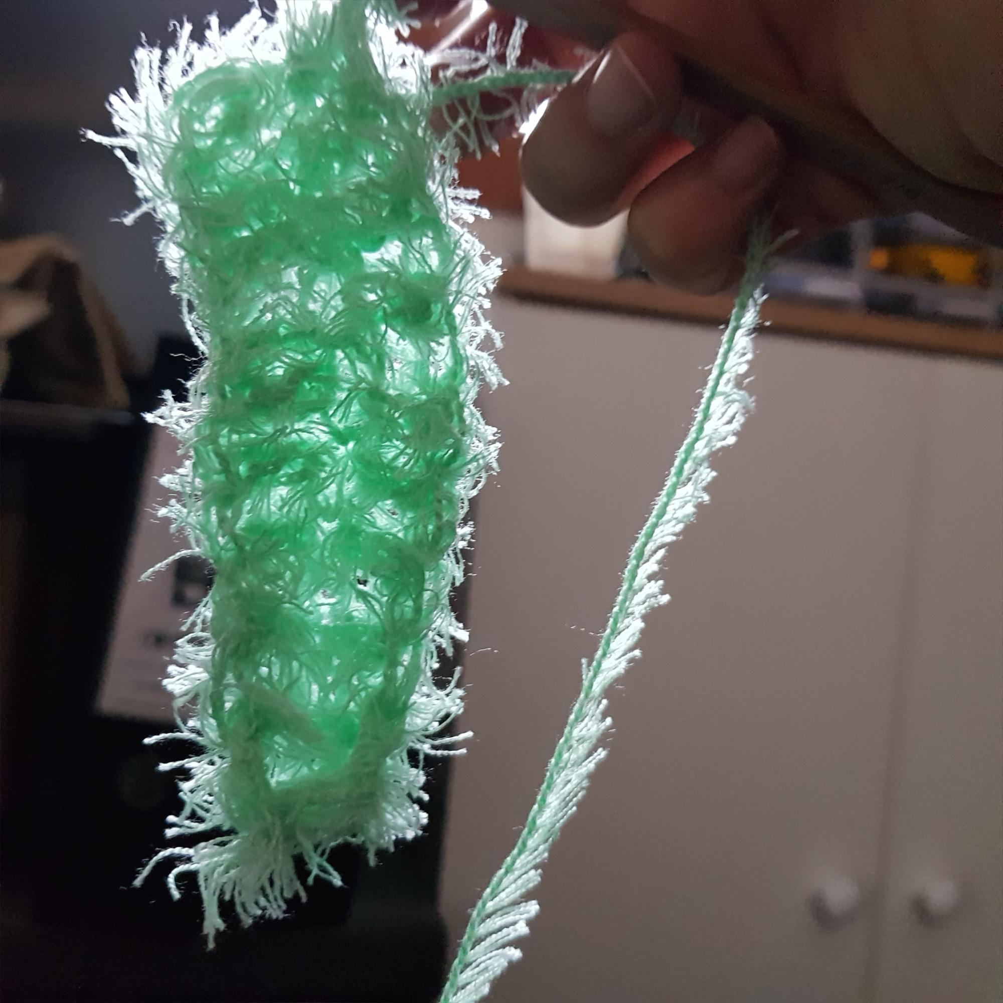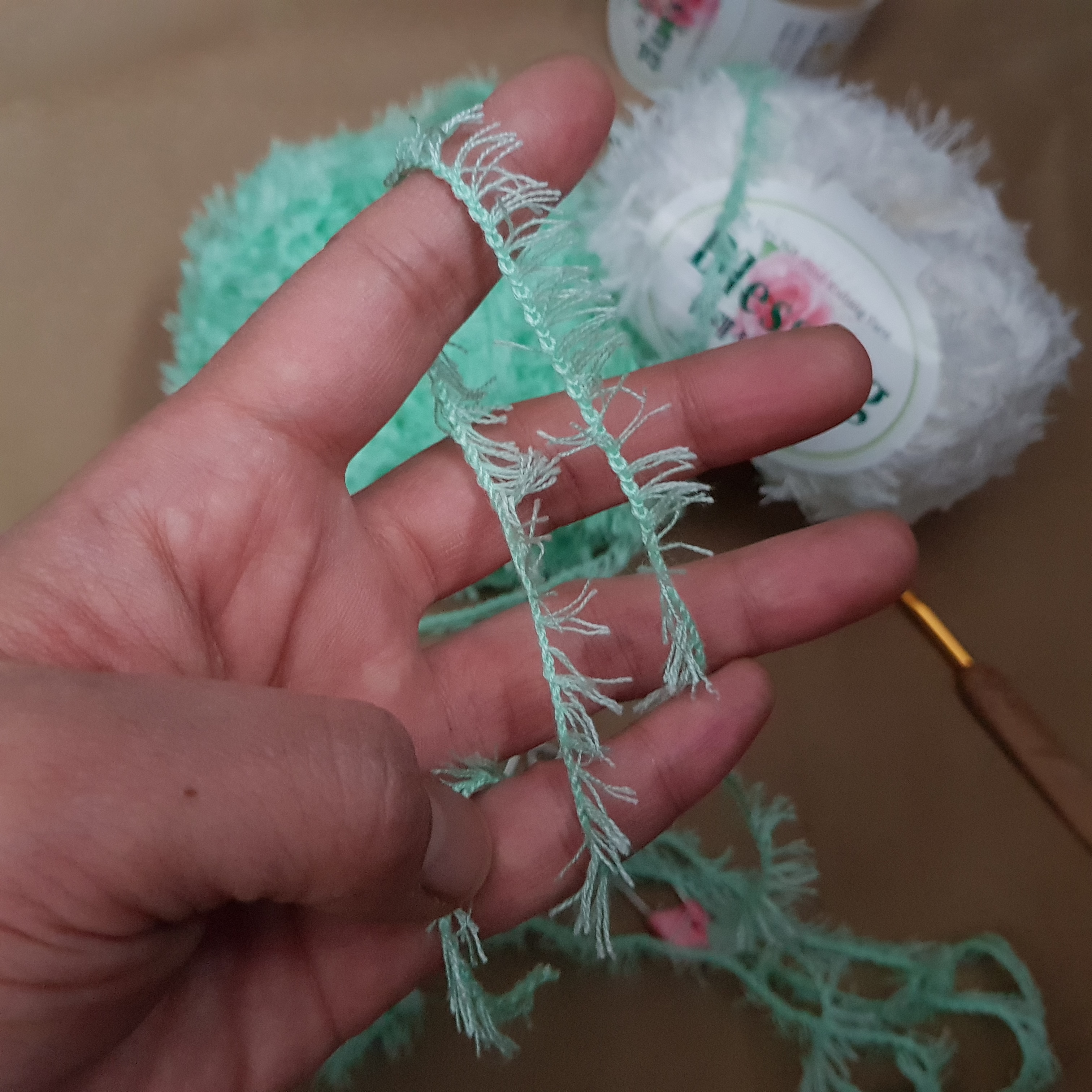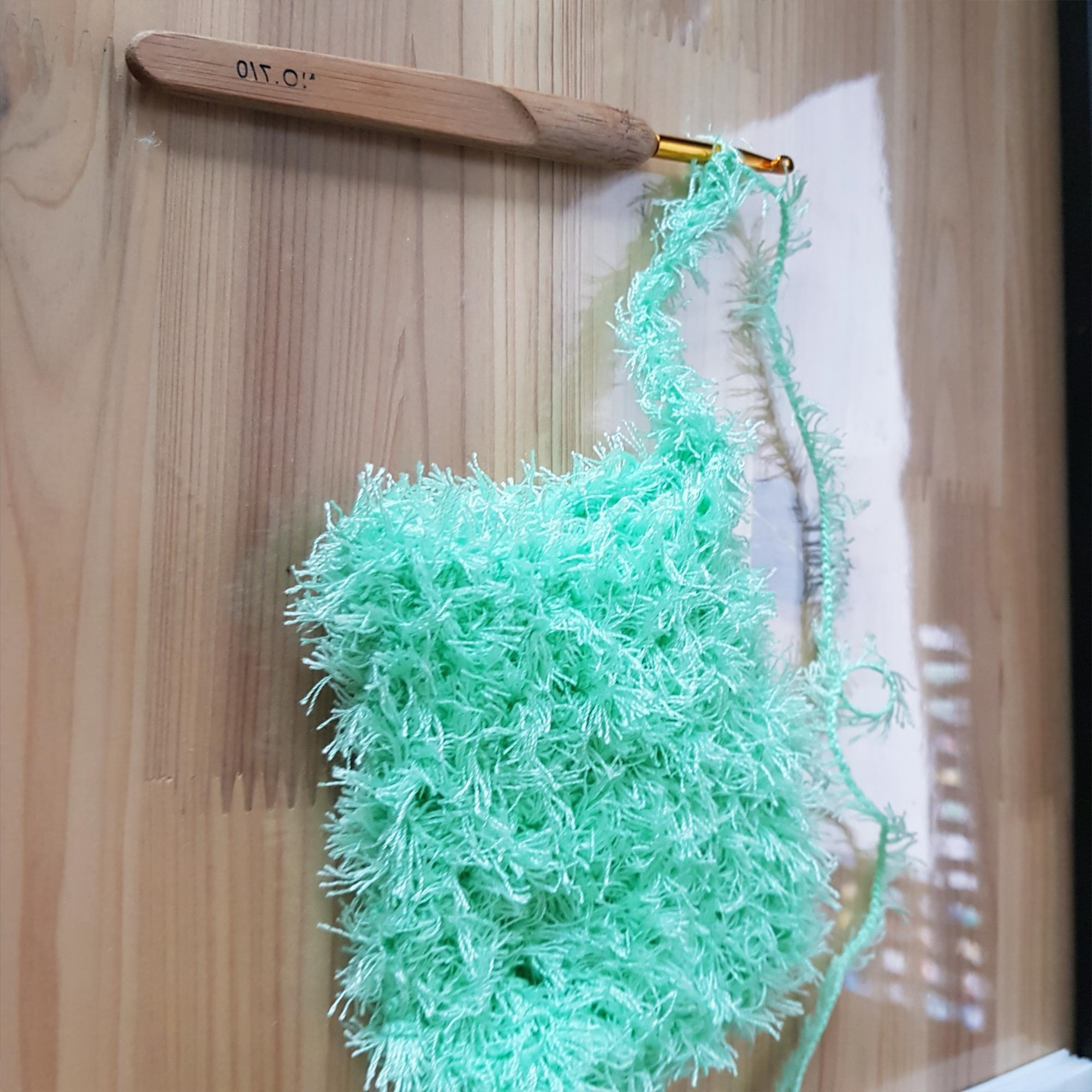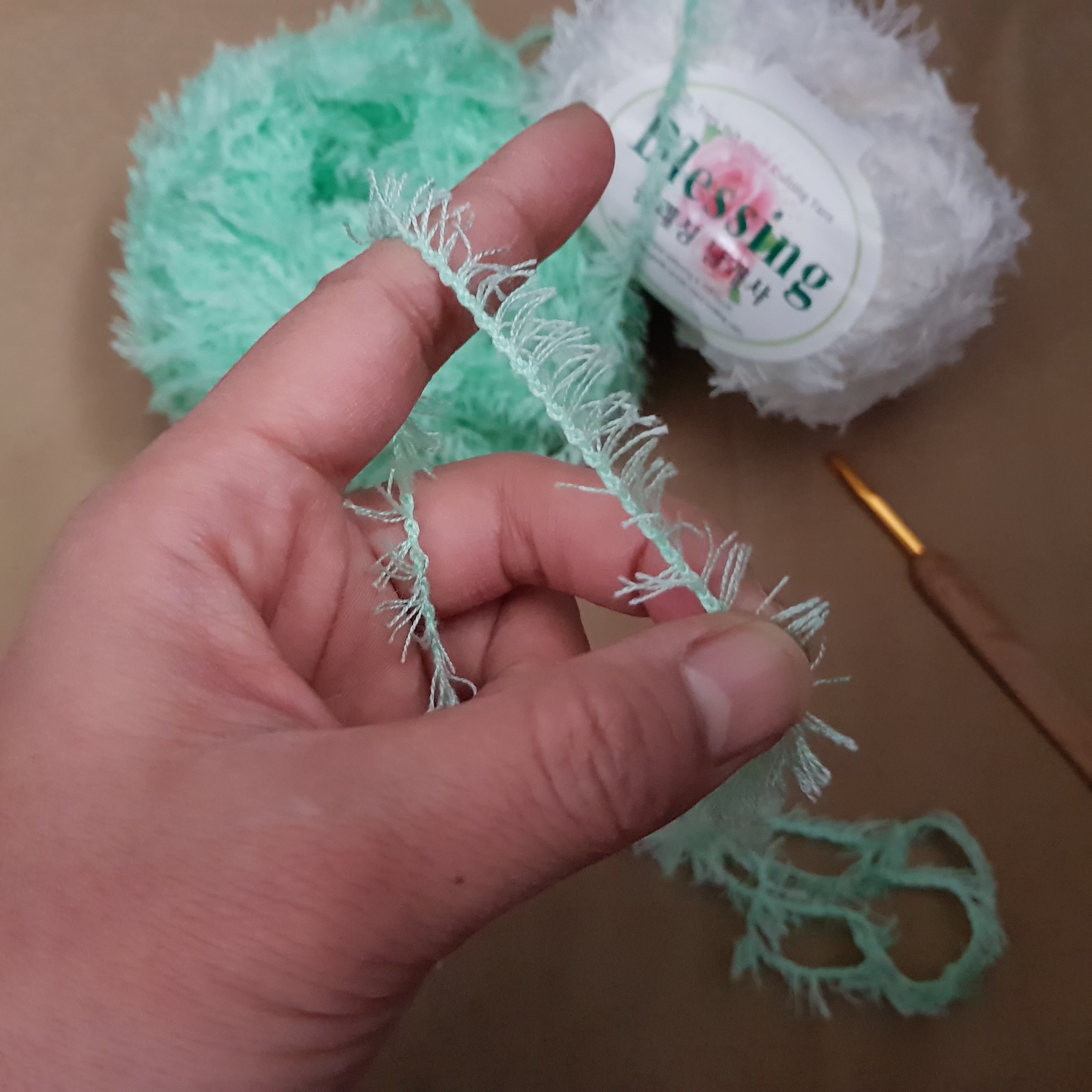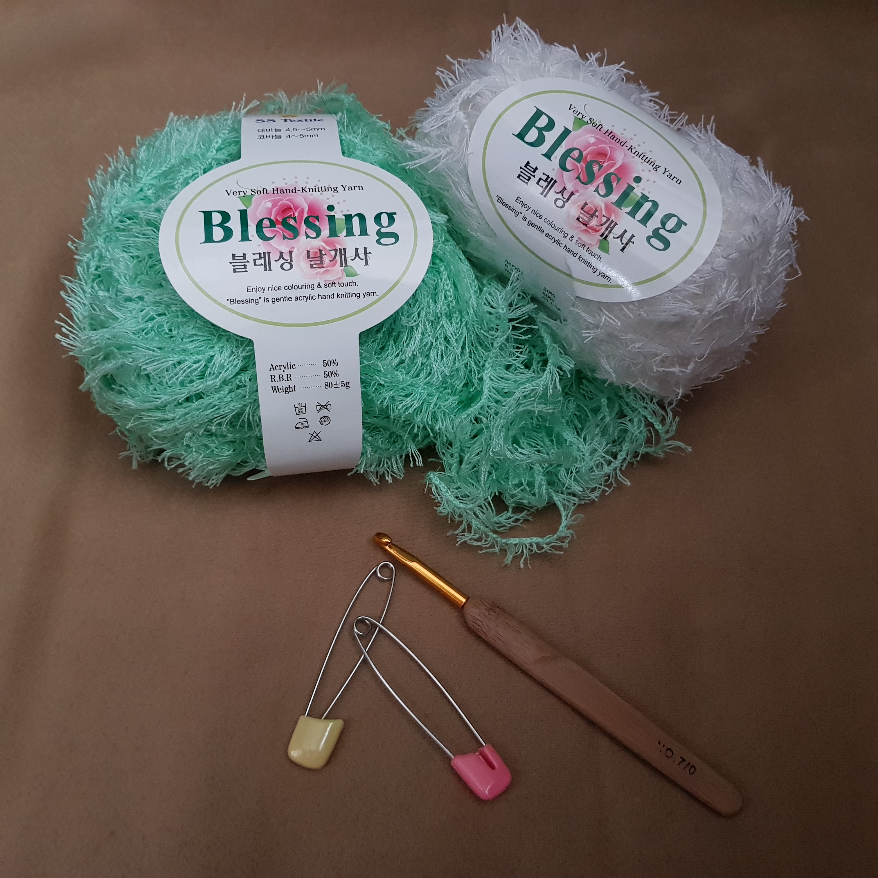 지금부터 천연비누 거품망 만들기 과정이다. 부드럽고 샤워타월로 제격이라는 털실 두 뭉치를 샀다. 털실 이름은 블레싱 날개사다. 얼굴에 비벼도 부드럽고 좋았다. 아이들 목욕 타월로 쓰기에도 아주 적합하다. 그러나 즐거움은 잠시였다. 비누 거품망을 뜨기 시작한 이후로 생각도 못한 단점들이 쏙쏙 드러난다.