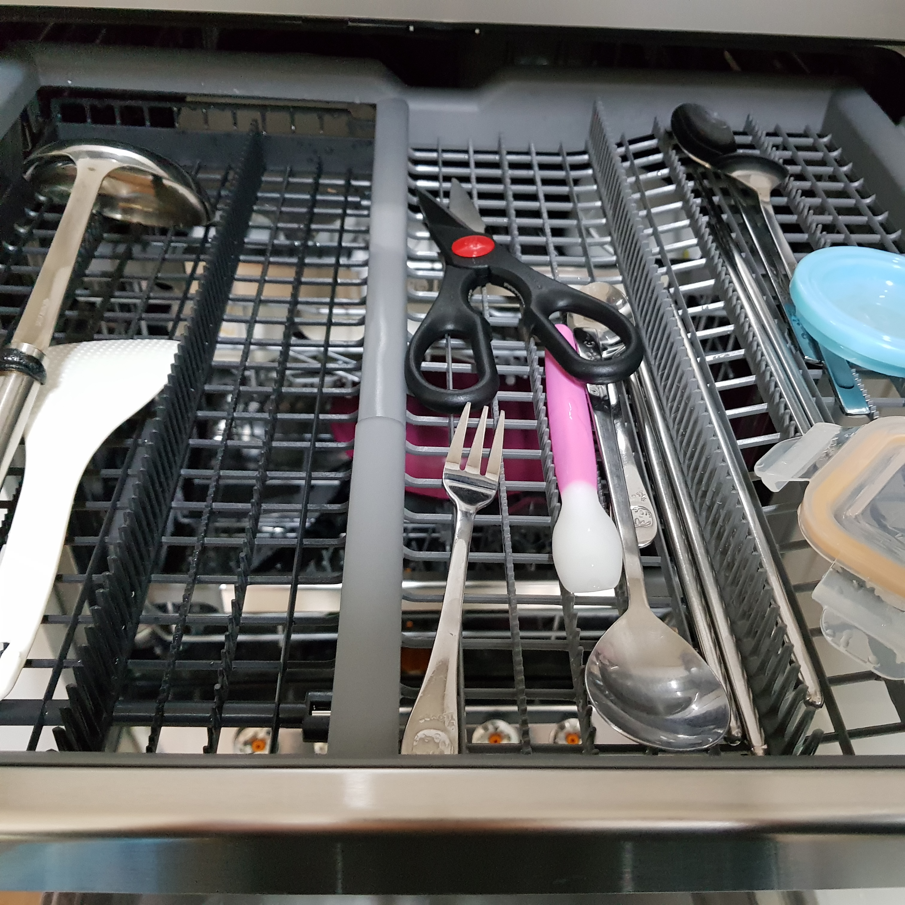 이제 LG 트루스팀 식기 세척기의 세척력을 확인해 보자. 설거지해야 할 그릇들을 식기세척기에 넣고 확인해 봤다. 계란 프라이를 한 프라이팬+뒤집개. 제육볶음 했던 웍, 가위, 칼 등등. 결과는 손 설거지보다 잘 닦인다. 미끌거리지 않고 뽀드득 잘 닦였다.