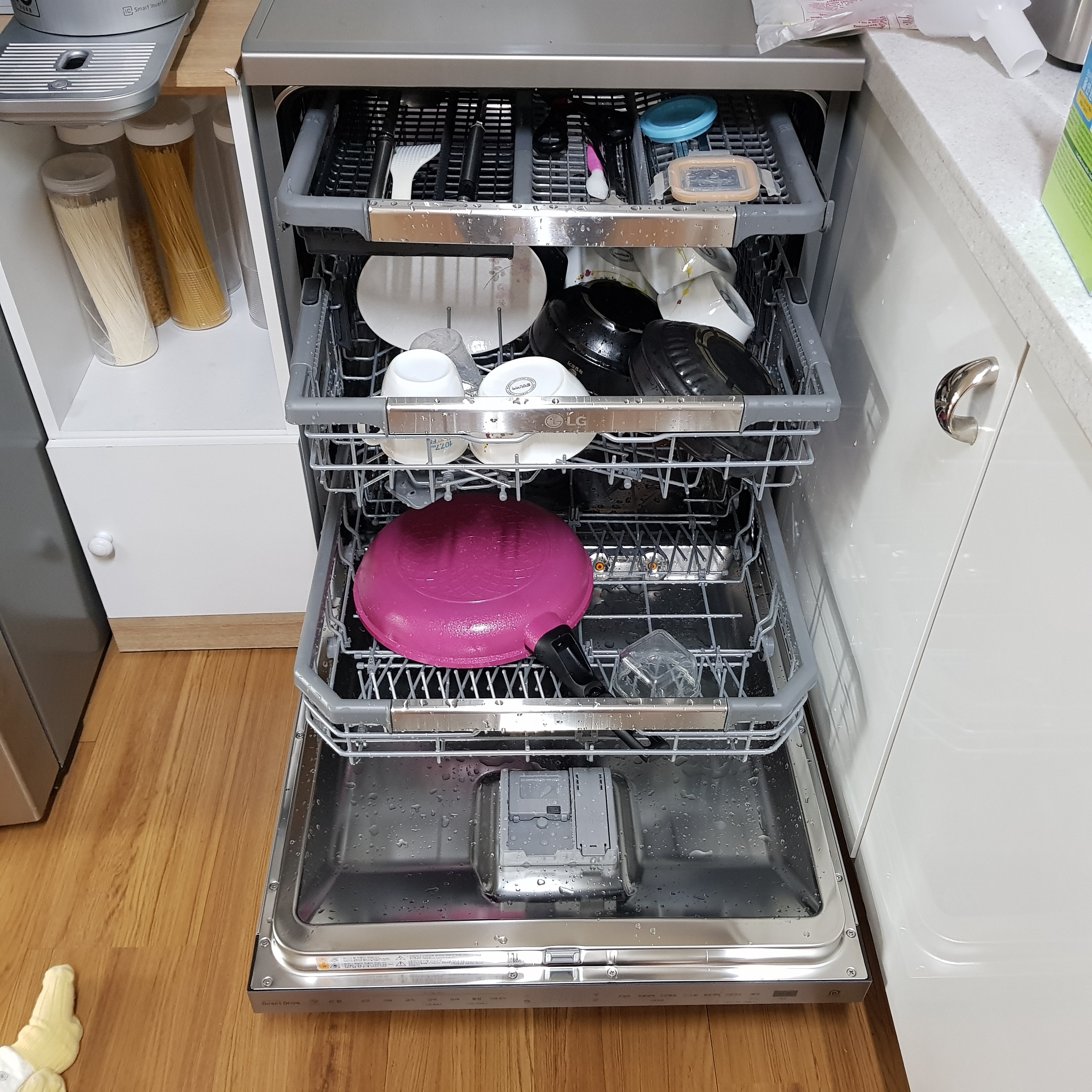 식기세척기 용량은 2인 가구도 12인용을 선택하는 것이 현명하다. 단순하게 생각해서 그릇을 빼곡하게 넣는 것보다 여유 있게 넣는 것이 물줄기를 맞는 면적이 커지므로 설거지도 더 잘 된다고 생각된다. 그리고 12인용을 선택해야 되는 가장 큰 이유는 큰 그릇들 때문이다. 냄비, 프라이팬, 웍, 도마, 쟁반, 밥솥 등. 대충 넣어도 다 들어간다. 선반 높이 조절도 가능해서 높이가 30cm 냄비도 잘 들어간다.