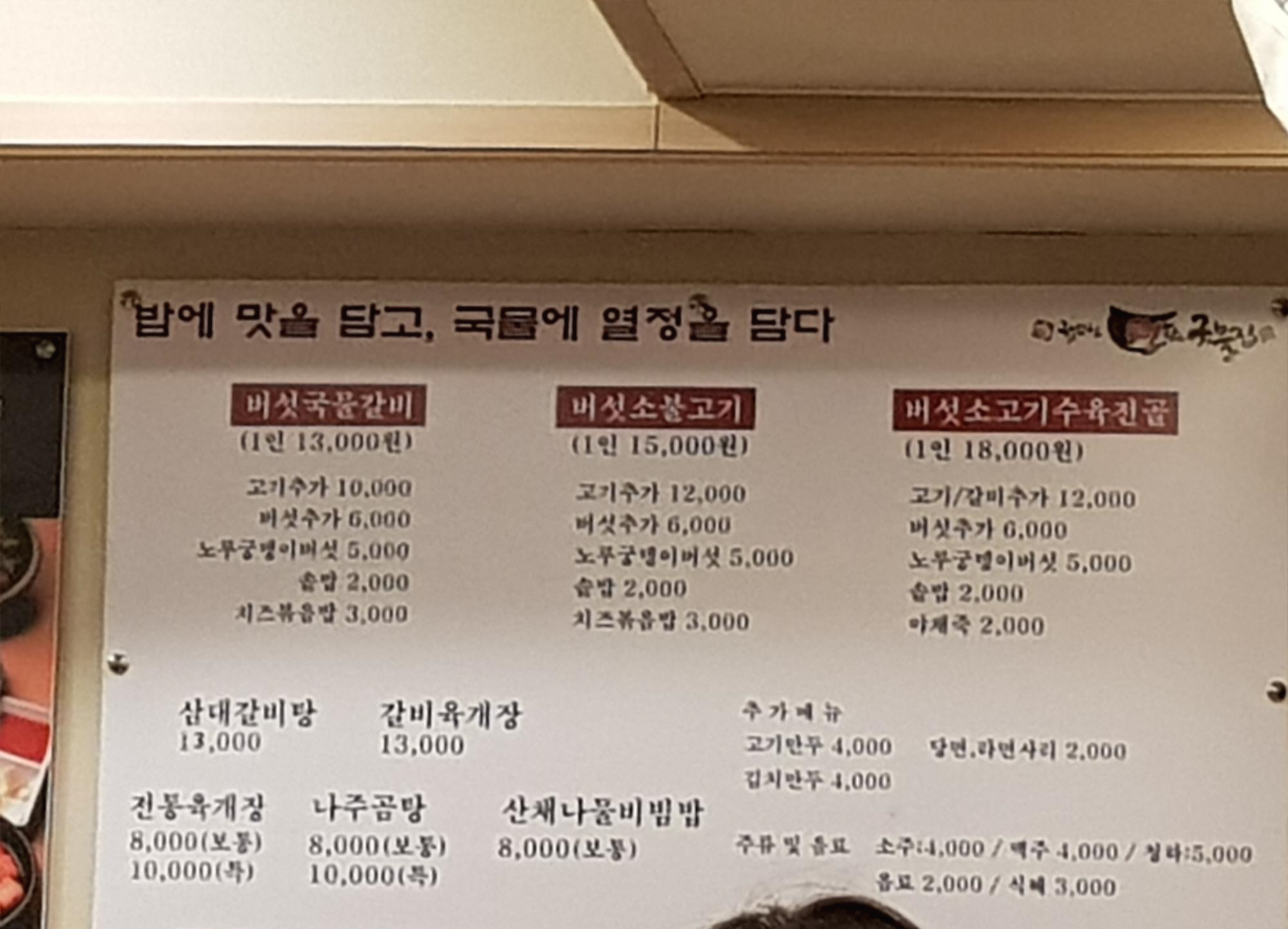 메뉴판을 보고 버섯국물갈비, 버섯소불고기, 버섯소고기수육전골을 시켰다. 그리고 육개장, 나주곰탕도 시켰다.