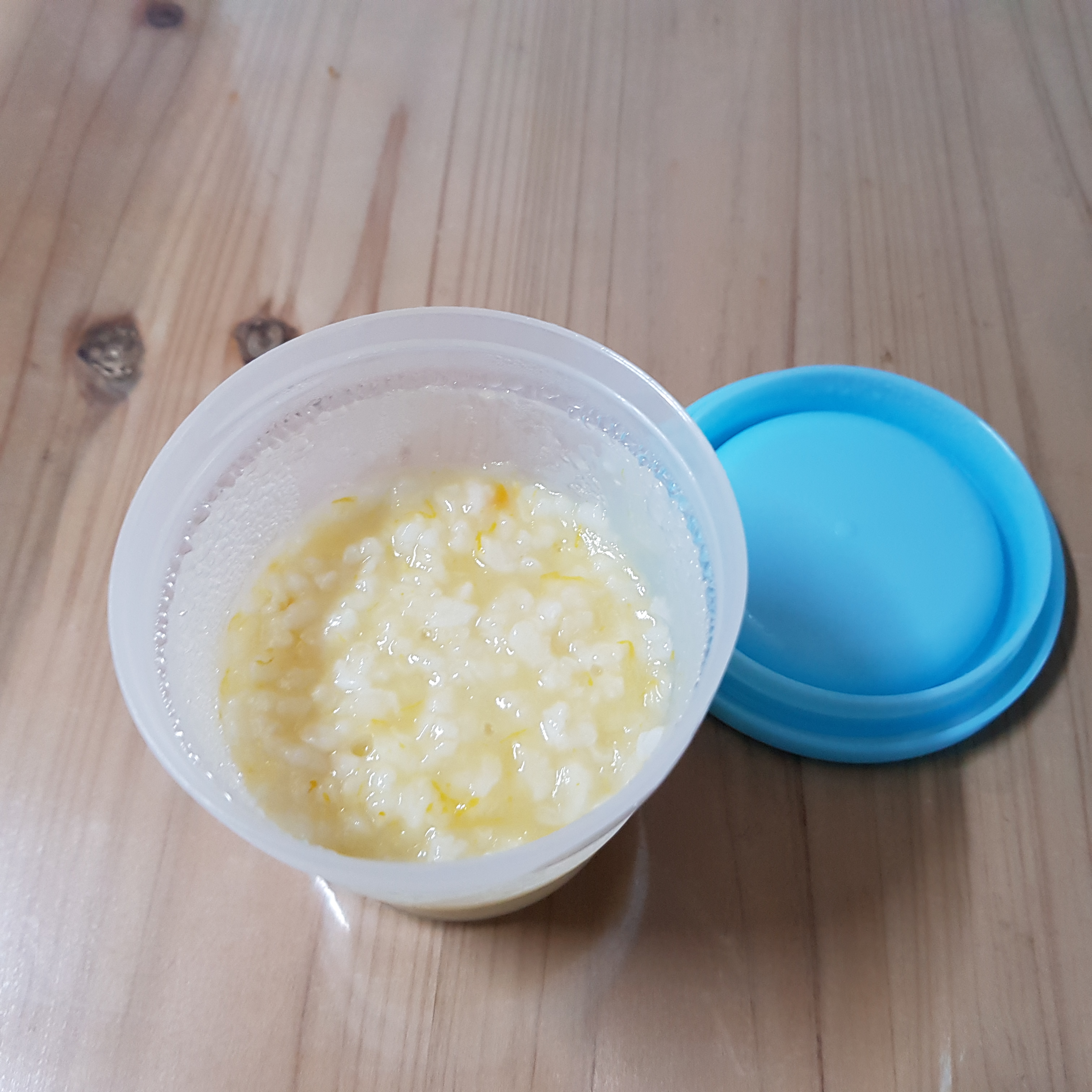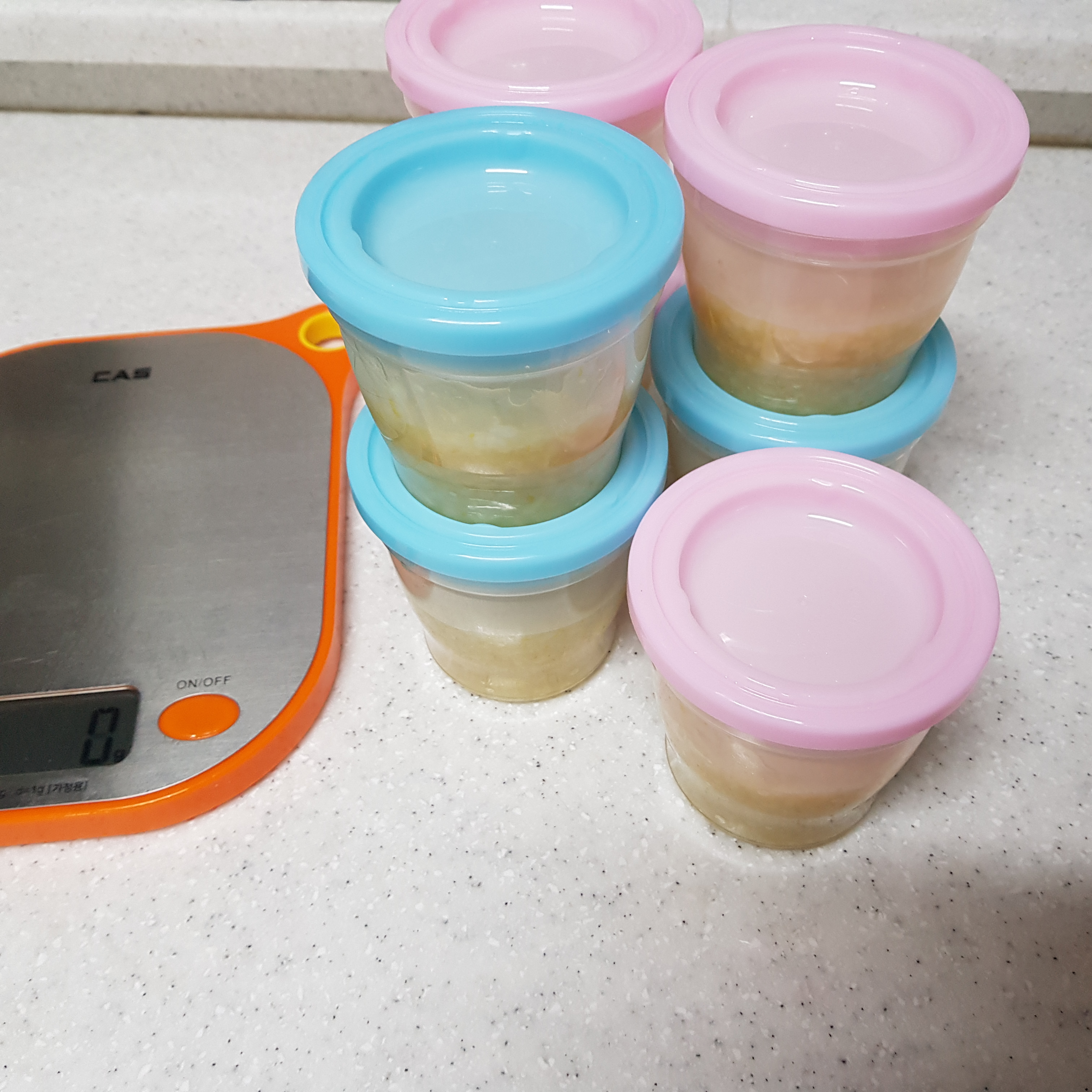이유식 용기에 소분하고 냉장고에 넣었다. 하루 정도가 지나면 밥알이 불어서 그런지 수분이 사라진다. 그래서 먹을 때 정수기 물을 20ml 정도 넣고 전자레인지에 데워서 먹인다.