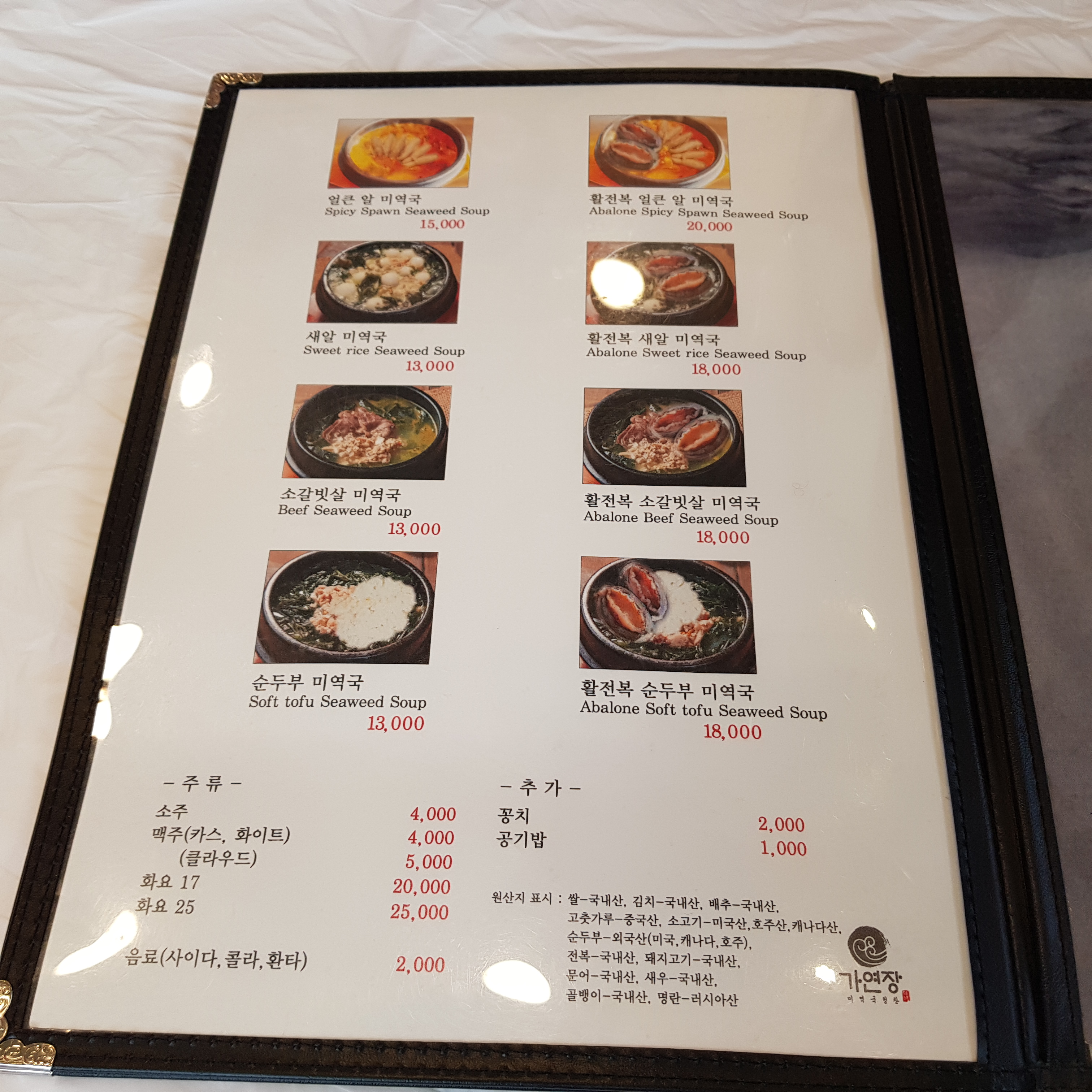 메뉴판 보고 소갈빗살 미역국과 가자미 미역국을 주문하고 돼지 불고기와 전복 회무침도 시켰다. 그리고 메뉴판에 모든 미역국에 조개가 들어간다고 써있지만 우리가 시킨 미역국에 조개는 없었다. 아마도 조개 국물만 들어간 게 아닐까 생각한다.
