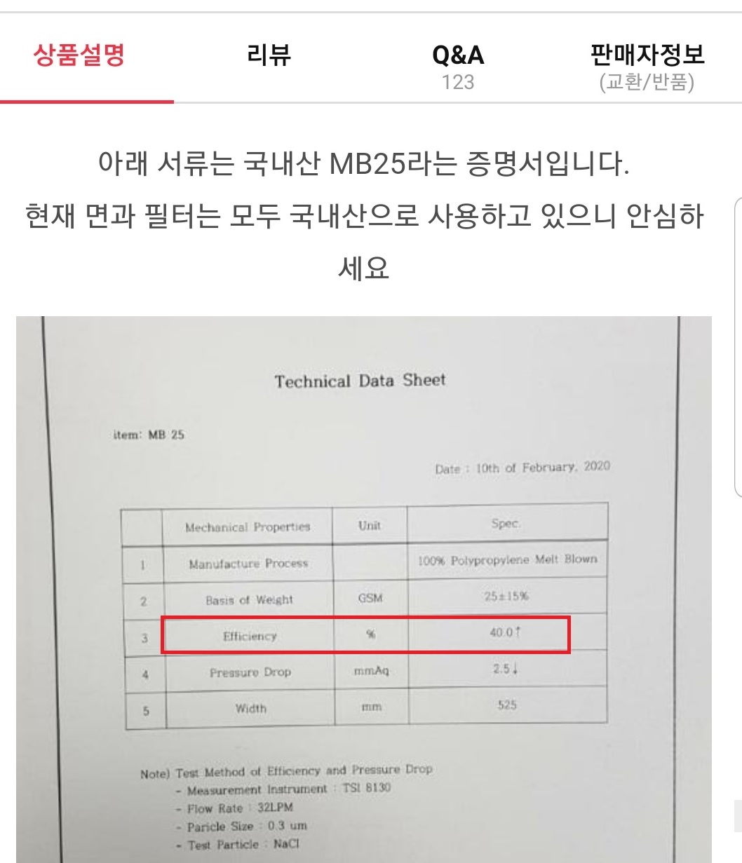 위의 사진이 판매자가 올려둔 국내산 MB 25라는 증명서다. 아무리 찾아봐도 국내산이란 말은 없다. 그러나 중국산이든 국내산이든 여과 효율만 좋으면 괜찮다고 생각했다. 위의 사진에서 빨간색 네모를 보면 Efficiency % 40↑ 적혀있다. 잉?? 40% 이상에서는 시험하지 않았다는 건가?! 내가 마스크 중간 필터를 2겹으로 결정한 이유가 여기에 있다. 2장을 사용한다고 해서 효율도 정비례하게 2배가 좋아지는 것은 아니겠지만 멜트블로운 25g보다 30g이 여과 효율이 더 우수하듯이 두꺼우면 효율이 더 좋아질 것이란 생각 때문이다. 그리고 더 기막힌 사실은 누가, 어디서 작성했는지 모르는 증명서 서류다. 공인된 시험 기관에서 작성한 데이터 시트가 아니고 제조사에서 작성한 것 같다. 과연 믿을 수 있는 제품일까?! 유량에 차이가 있지만 테스트 방법은 보건용 마스크 효율 시험 방법과 비슷한 거 같다. 모르겠다. 난 쓰기로 결정했다. 어차피 필터 구하기도 힘들다.