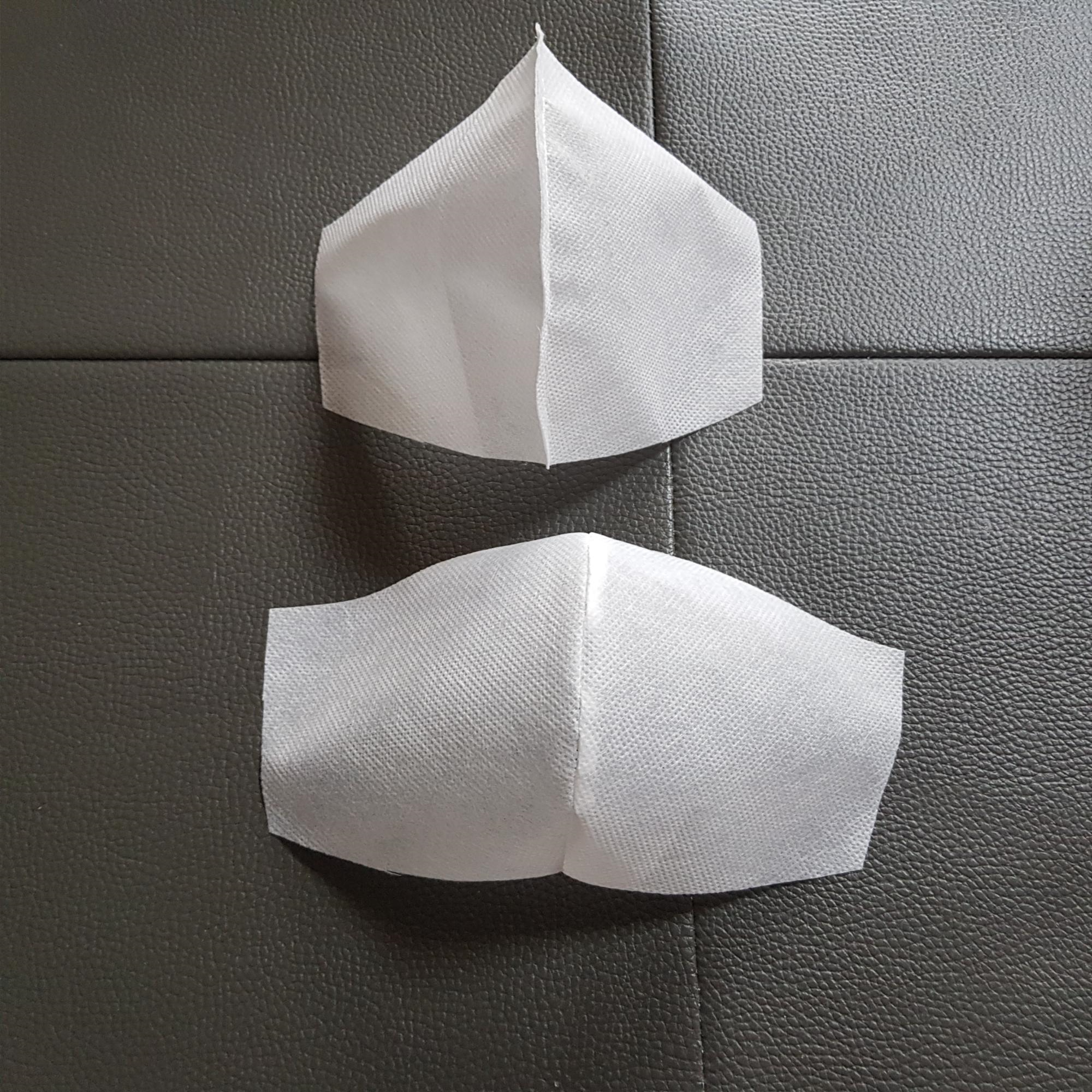 중간 필터는 손상을 최소화하기 위해 가운데를 재단하여 재봉하지 않고 위의 사진과 같이 접어서 입체로 만들었다. 바늘 구멍 보다 차라리 접는 방법이 마스크용 멜트블로운 필터 손상을 줄일것 같았다. 그리고 멜트블로운 필터의 엠보 부분이 입을 향하게 했다. 최대한 중간 필터는 만지지 않고 바늘구멍도 남기지 않으려고 노력했다.