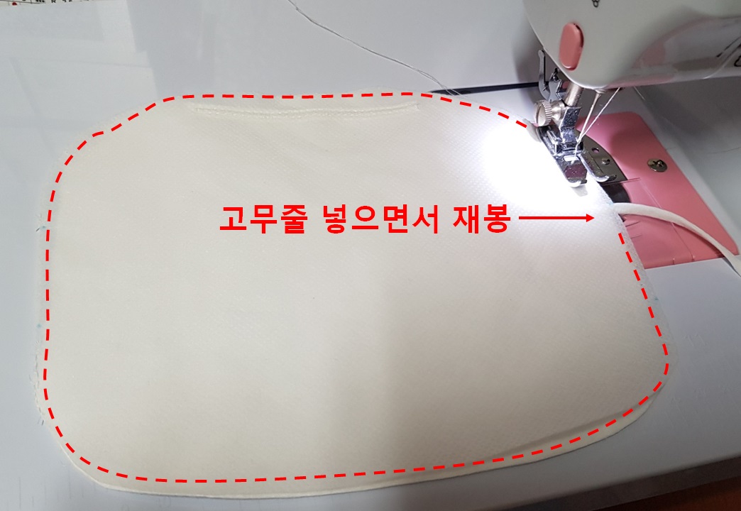 패브릭 와이어를 단 부직포1 위에 부직포2, 멜트블로운 필터, 부직포2를 순서대로 놓고 테두리를 재봉 한다. 혼스미싱으로 재봉하면서 고무줄 위치에는 고무줄을 넣고 재봉 했다. 난 부직포1과 부직포2 사이에 고무줄을 넣었다.