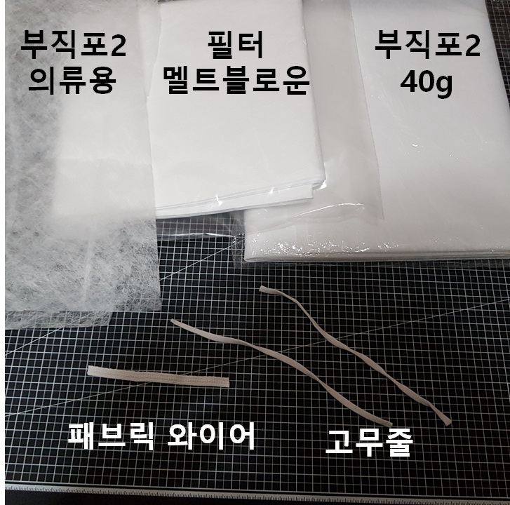 부직포1, 부직포2, KF94 필터(멜트 블로운), 패브릭 와이어, 고무줄.