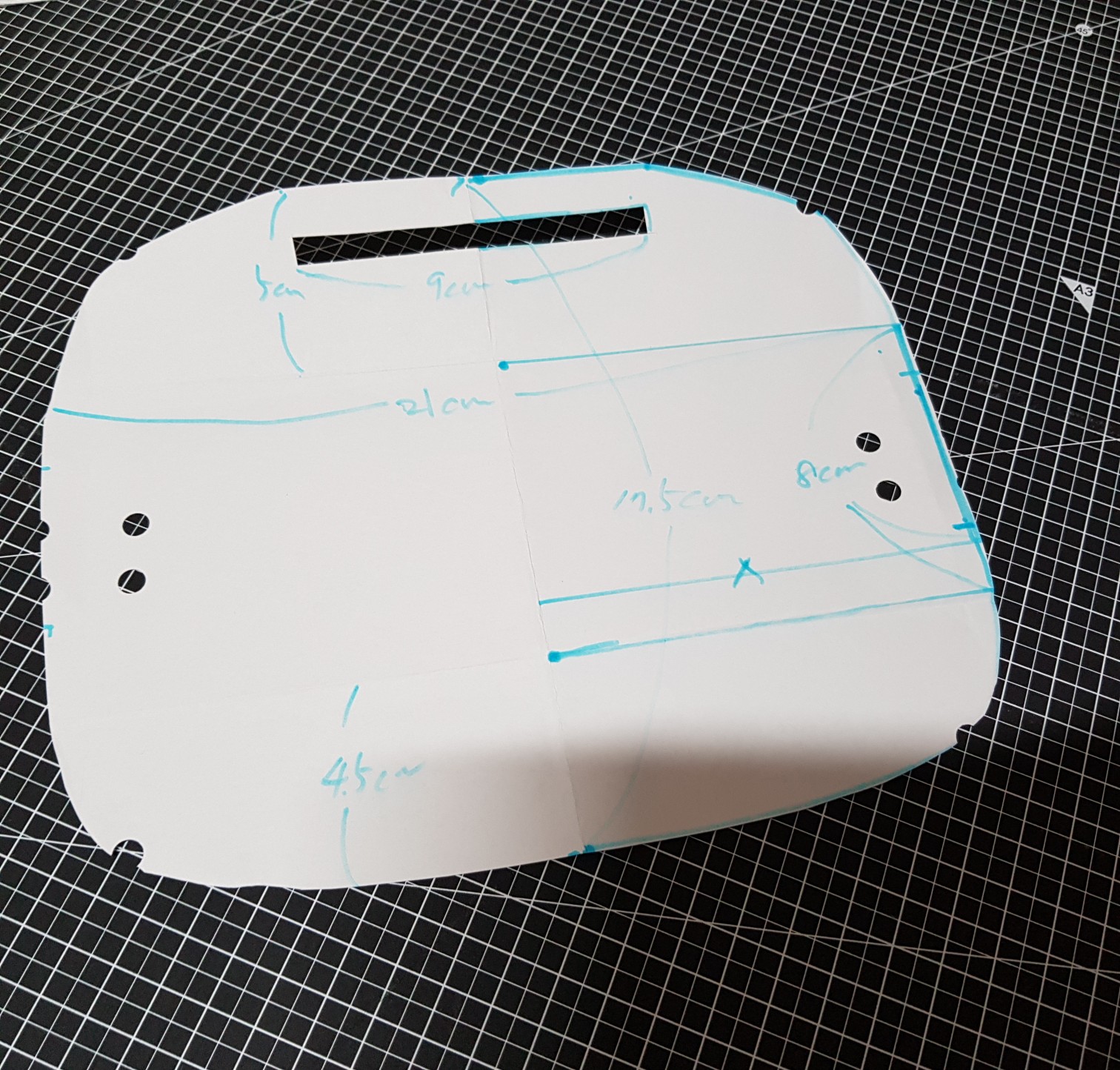 위의 사진과 같이 기성용 마스크를 종이에 대고 점을 찍었다. 그리고 잘 연결한다. 좌우 대칭이라 반 접어서 가위로 잘랐다. 동그란 구멍이 뚫린 부분은 글루건으로 붙일 위치다. 엄청 대충 만든 거 같지만 6번 정도 실패 끝에 완성했다.