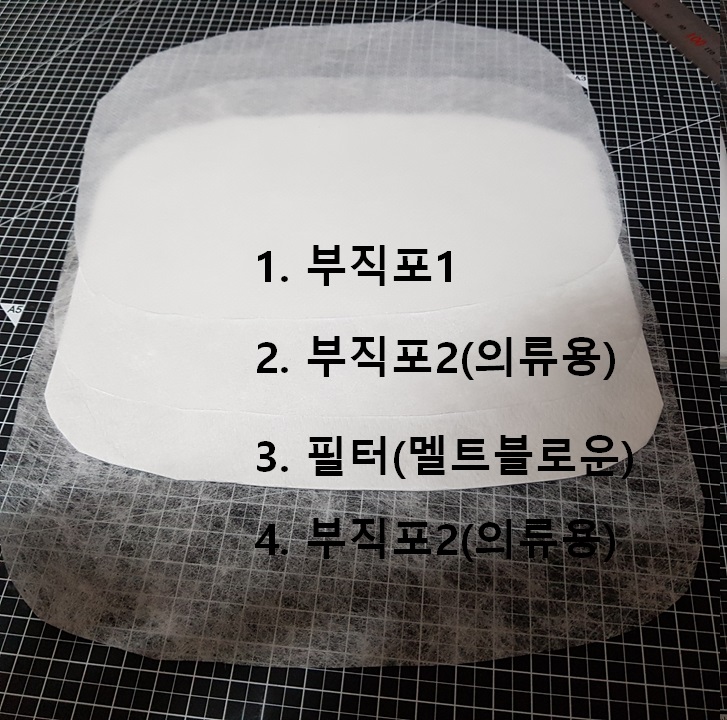 위의 사진에 보이는 순서와 같이 4겹으로 만들었다. 처음에 의류용 부직포는 사용 계획이 없었는데 필터 다루기가 너무 힘들어서 사용했다. 필터는 만지면 만질수록 보풀이 계속 생기고 미싱 할 때도 잘 안 밀린다. 그래서 필터 손상을 최소화하기 위해 의류용 부직포로 필터를 씌워서 작업했다.