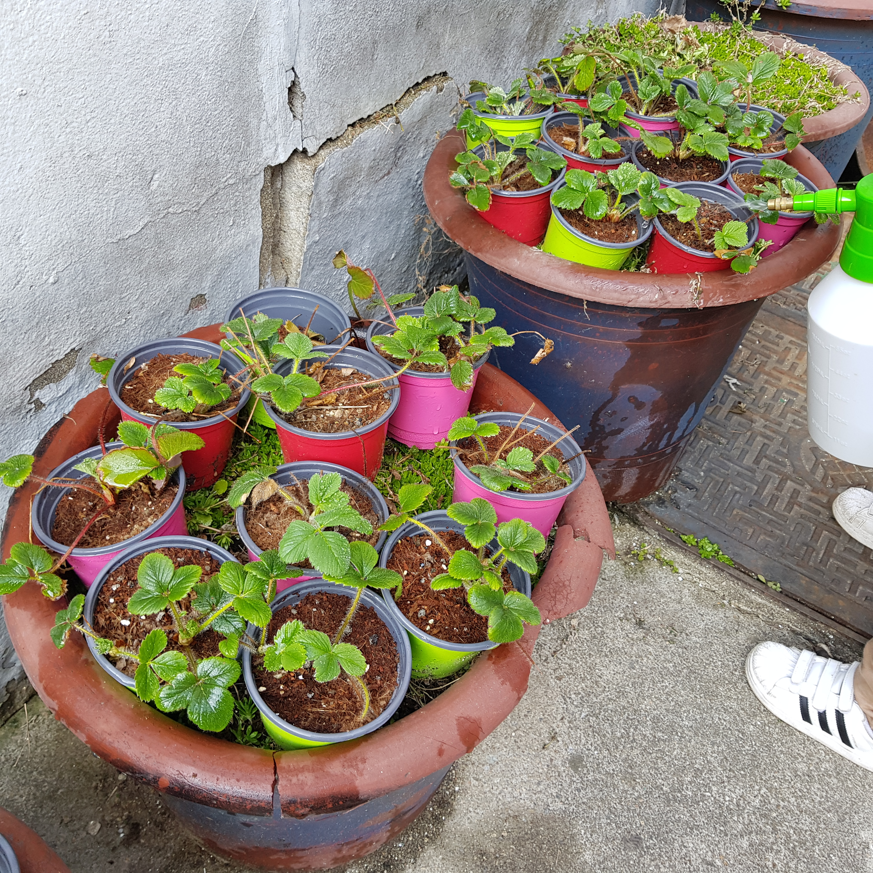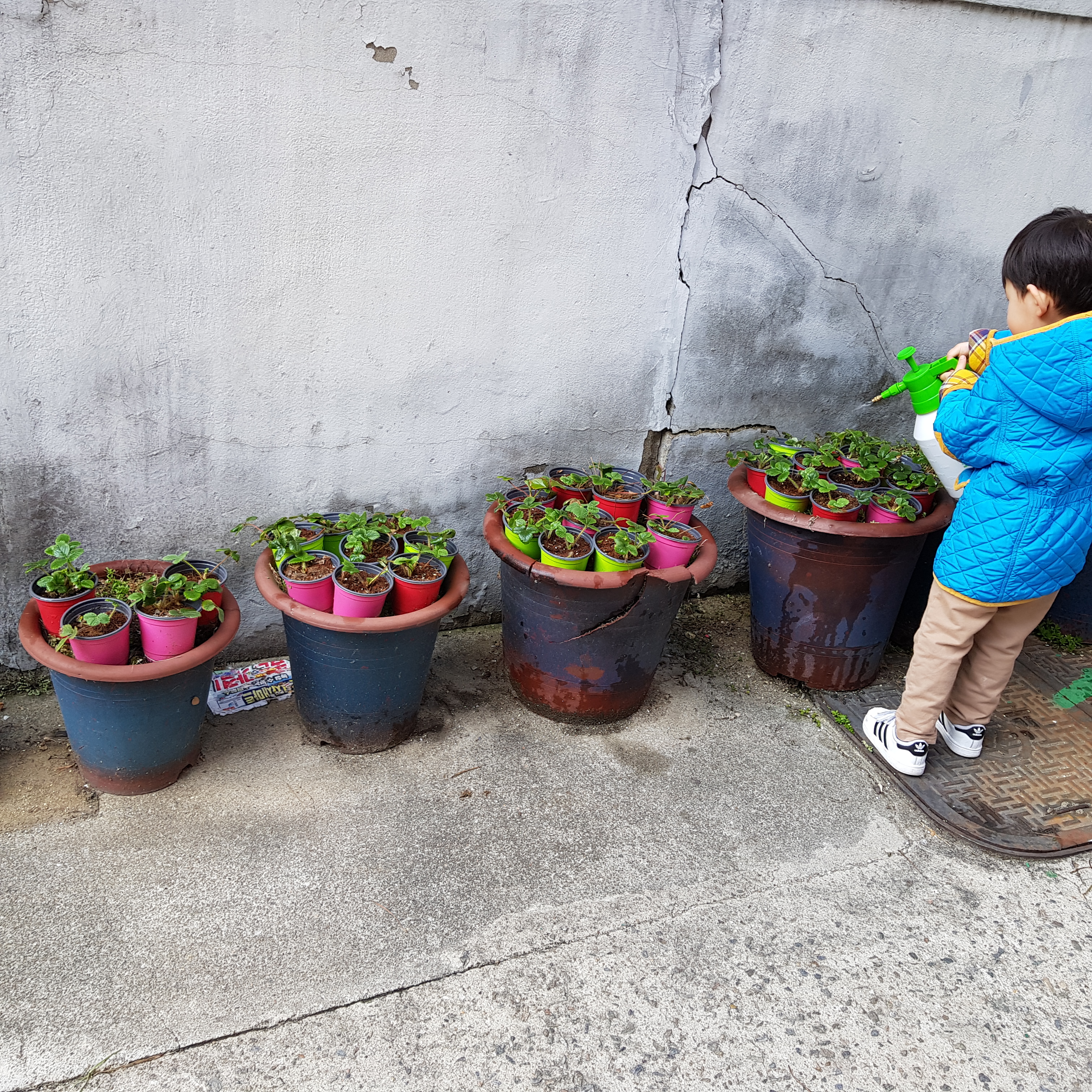 화분에 있는 딸기 모종은 햇빛이 잘 드는 곳으로 위치를 바꿨다. 그리고 물도 많이 줬다. 물론 물 주기는 아들이 도와줬다. 도와준 건지 방해한 건지 딱히 구분은 안되지만 아들은 딸기밭에 물 주는 것을 무척 좋아한다.
