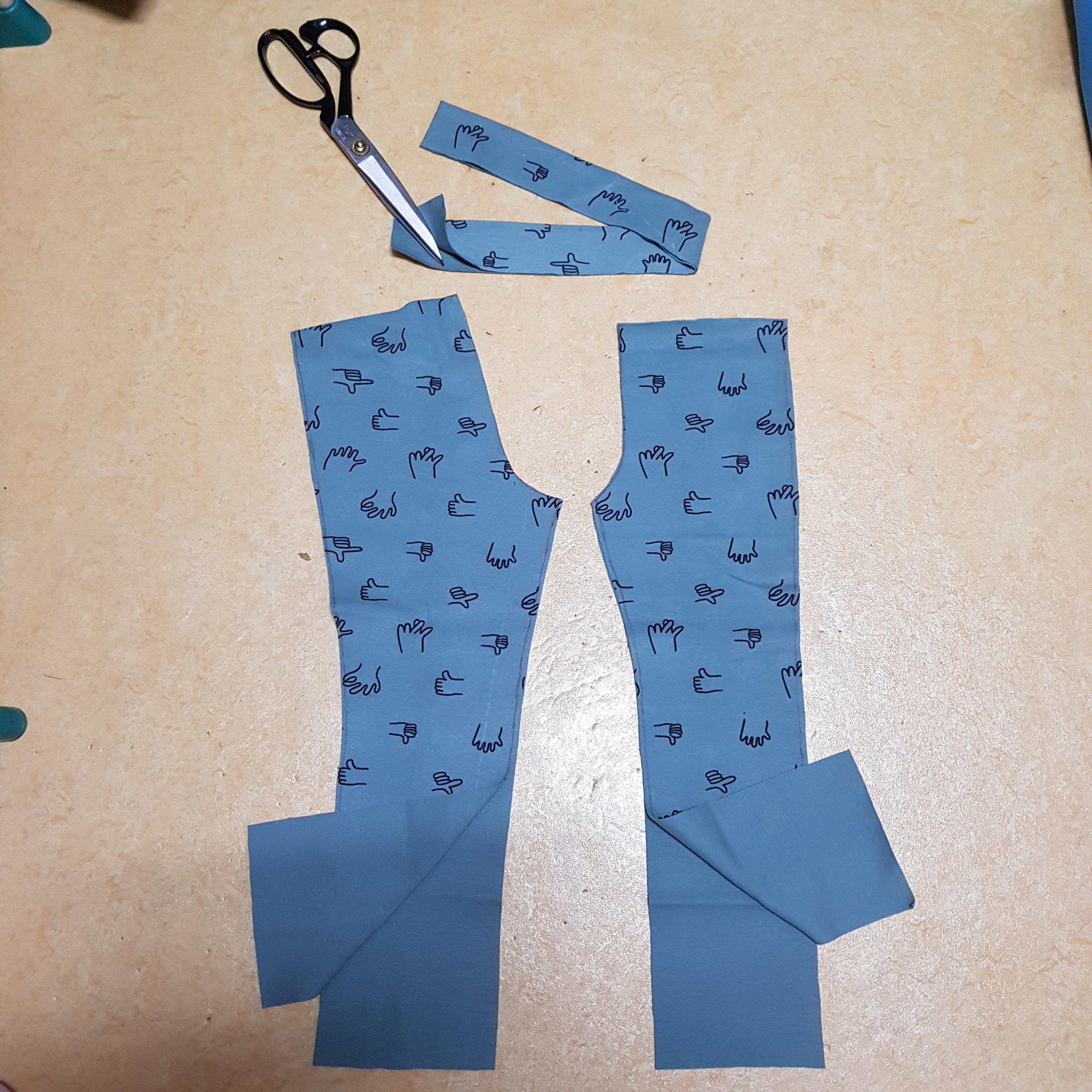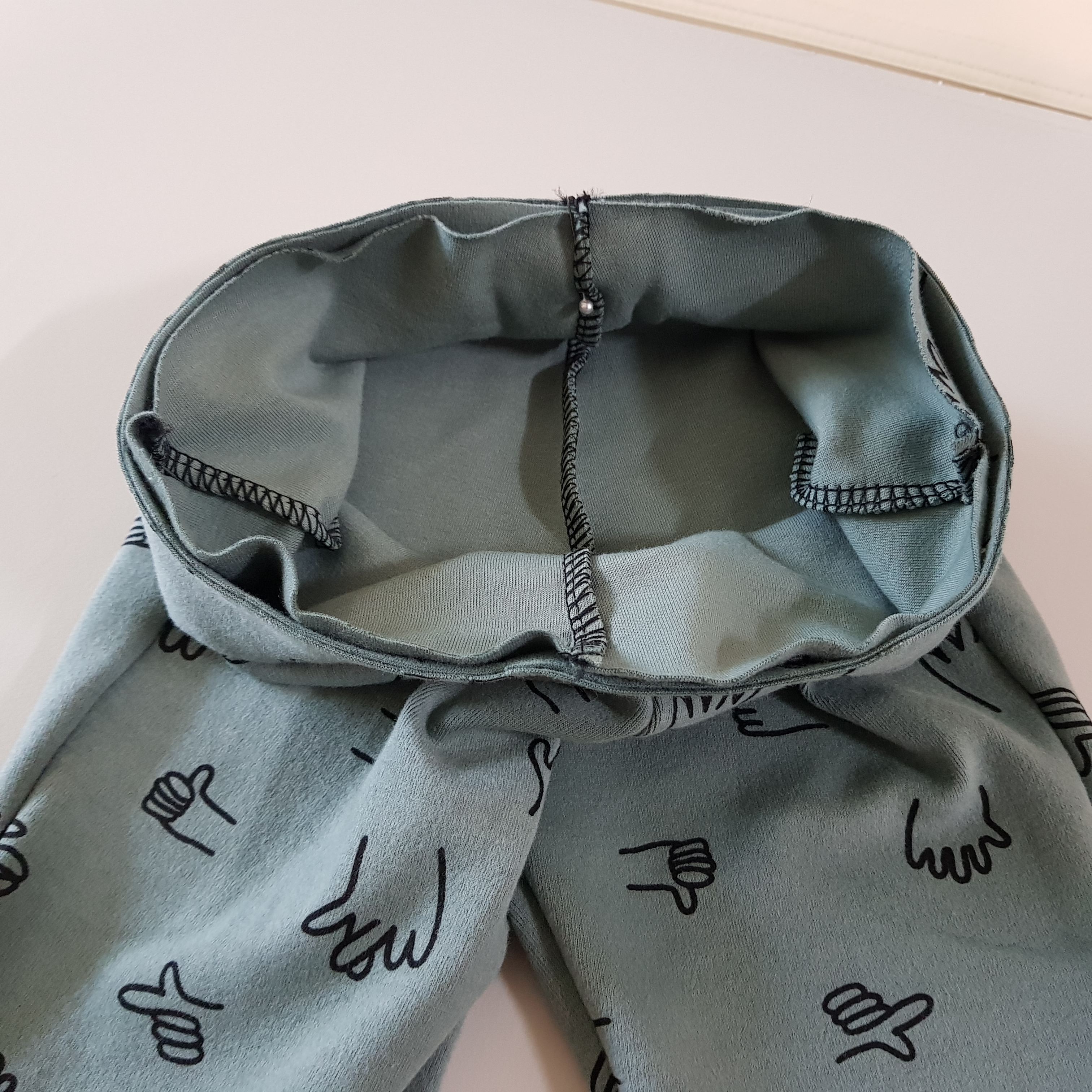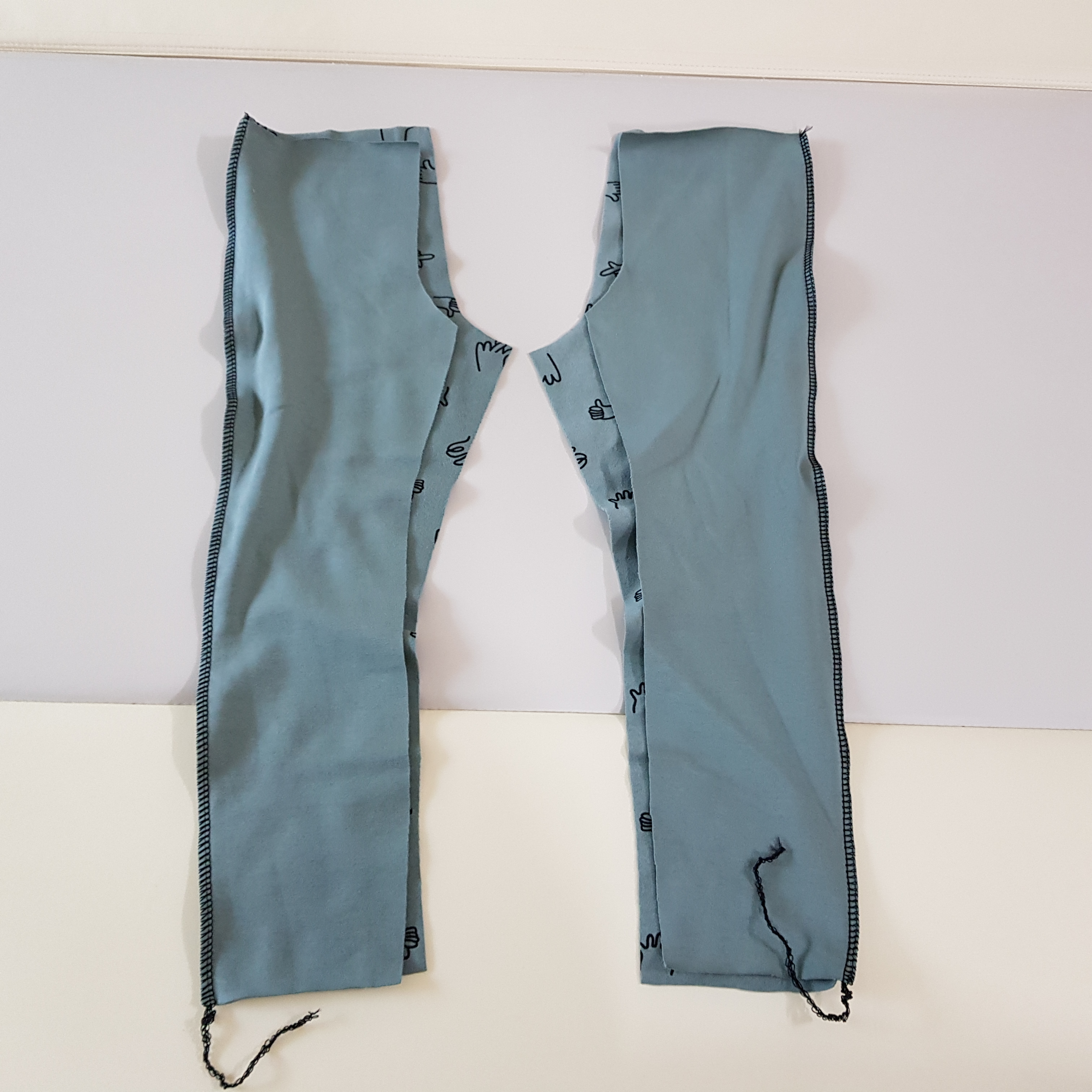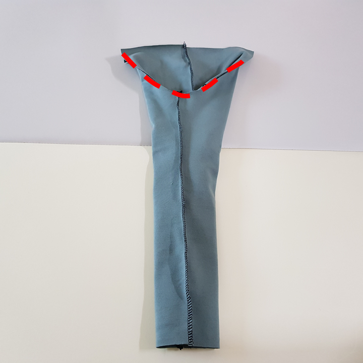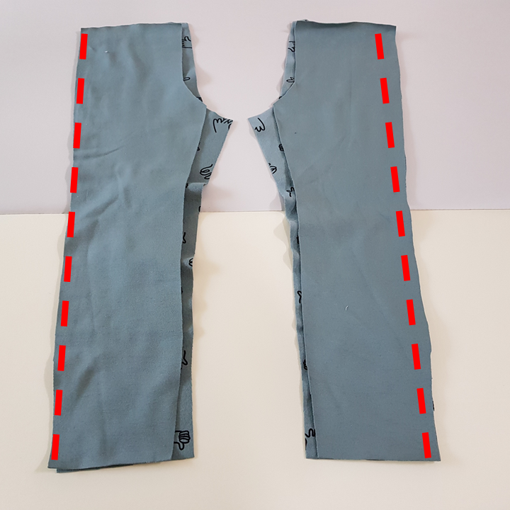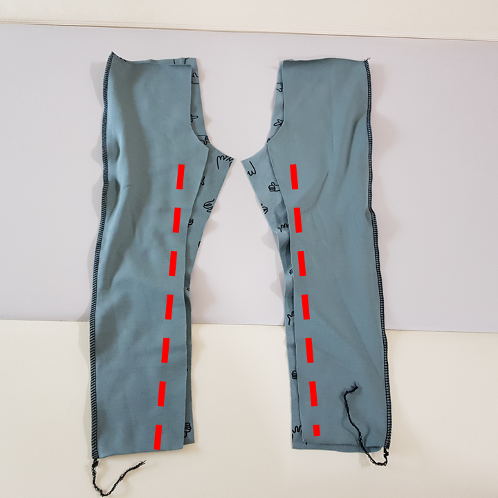 바깥쪽과 안쪽 옆선을 재봉했다면 가랑이 재봉을 위해 가장 만들기 쉬운 바지의 겉면이 마주 보도록 하고 뒤집는다.