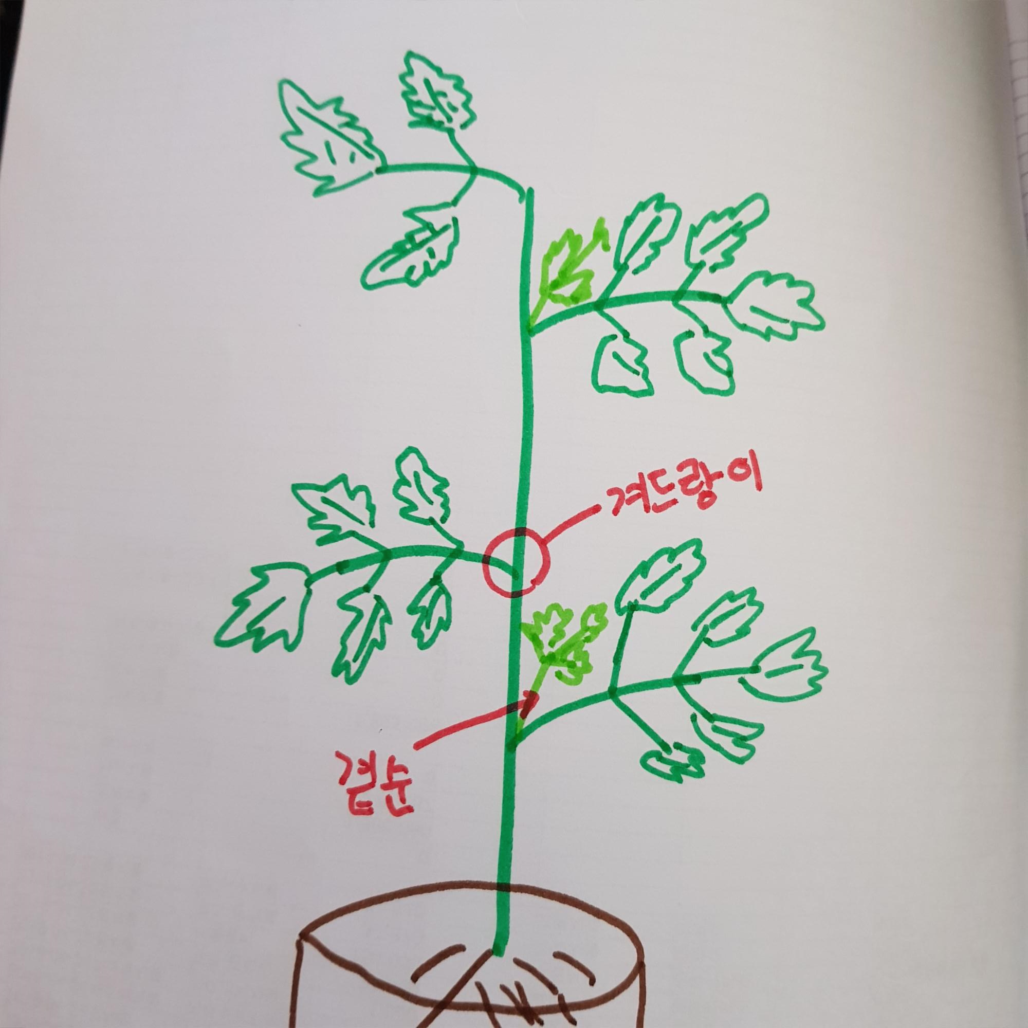 폭풍 검색을 한다. 방울토마토 키우기 곁순 따기. 곁순이란 식물의 잎 겨드랑이에서 생기는 싹이라고 한다. 겨드랑이?? 방울토마토에도 겨드랑이가 있구나~ 위의 사진에서 표시한 부분이 곁순이다.