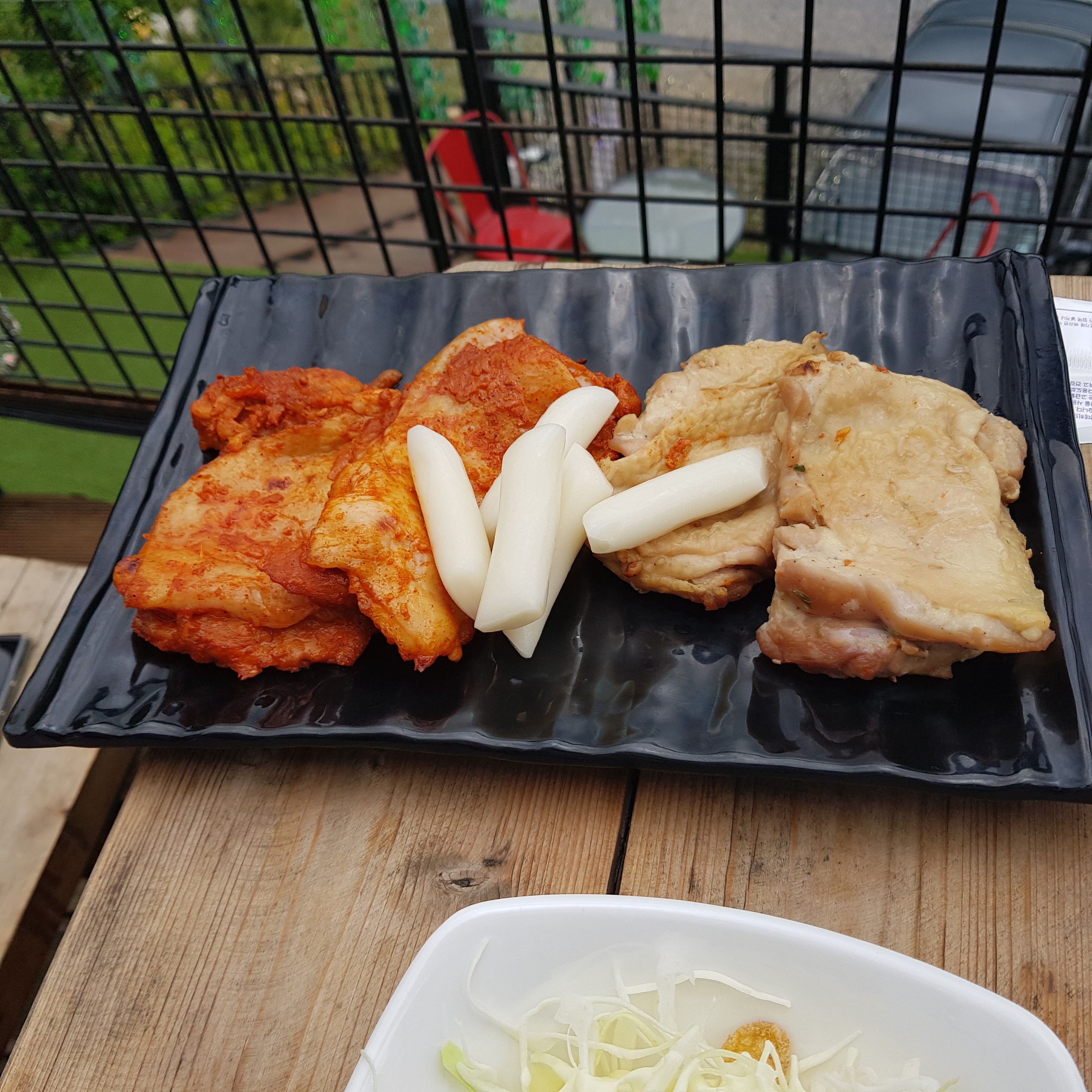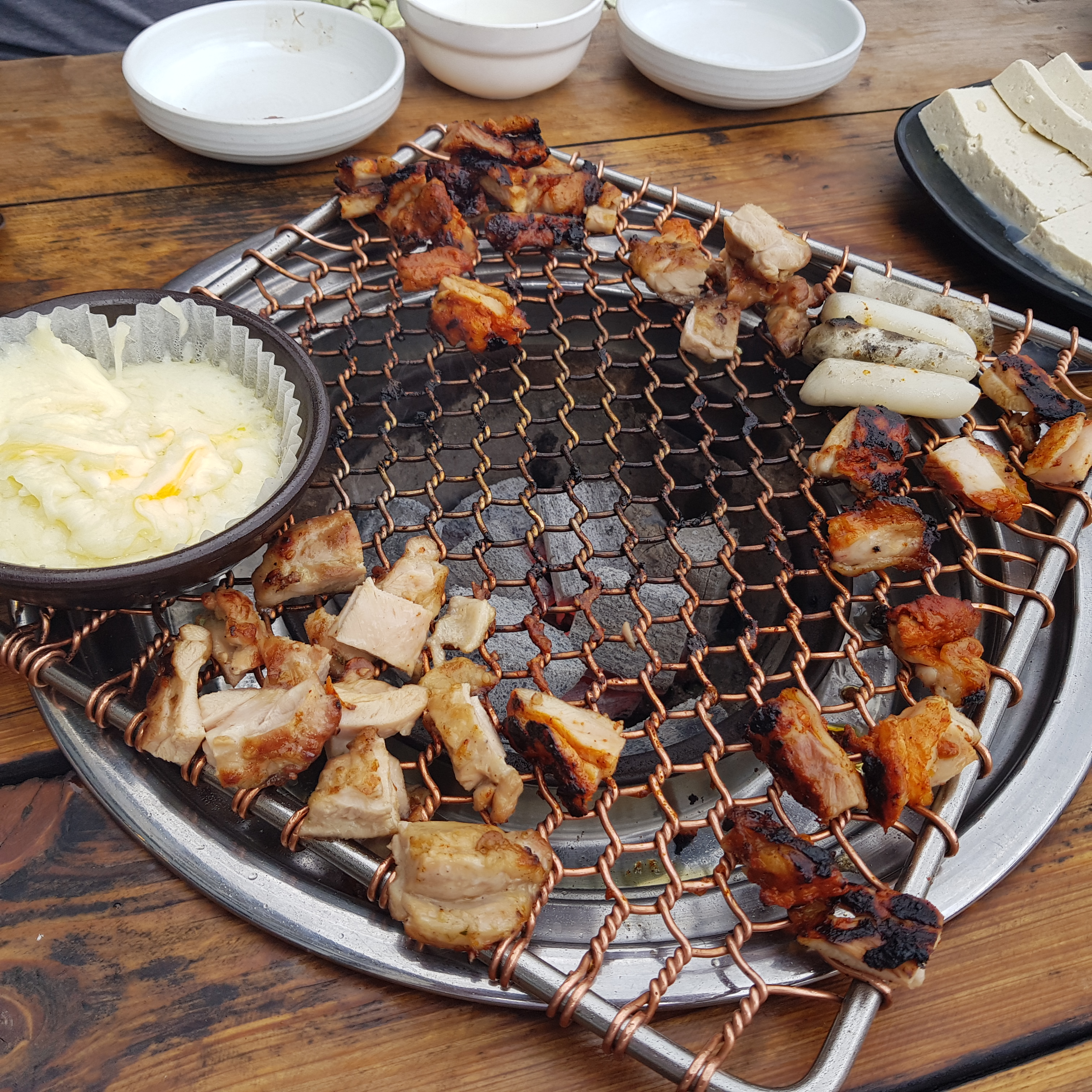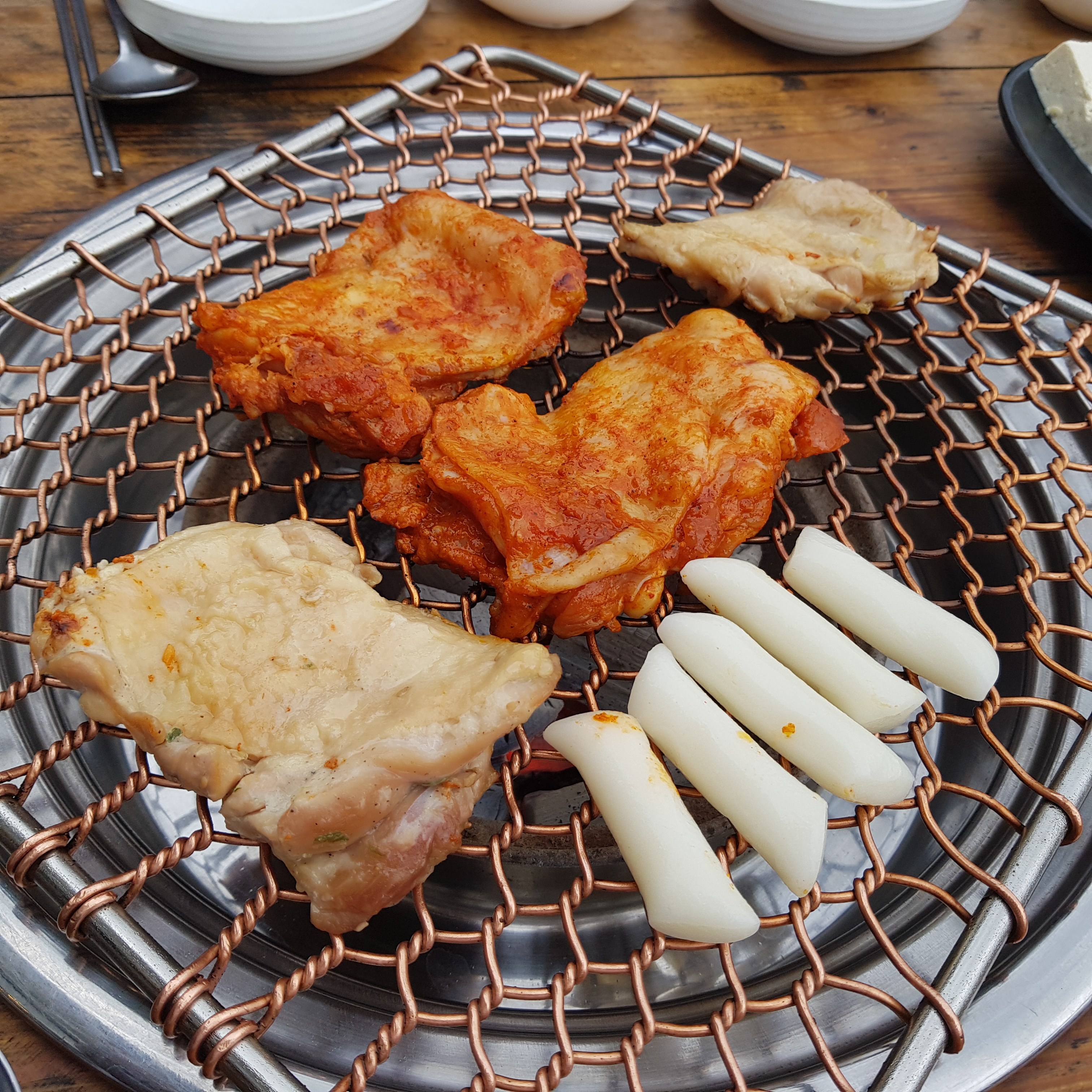 닭갈비는 초벌되어 나온다. 그래도 한참을 익혀야 익는다. 맛있다. 숯불에 구우면 뭐든 맛있는 것 같다. 간장 숯불 닭갈비 맛있다. 고추장 숯불 닭갈비도 맛있다. 하지만 역시 빨간 양념이 훨씬 맛있다. 간장 양념이 된 닭갈비는 아이들 때문에 시켰는데 아이들은 한입도 먹지 않고 계속 떠들고 핸드폰만 봤다. 아이들 때문에 시달려서 그런지 입맛이 없었다. 간이 좀 약한 거 같기도 하고. 처음에 한입만 맛있었다. 퐁듀는 신랑이 많이 좋아했던 거 같다.