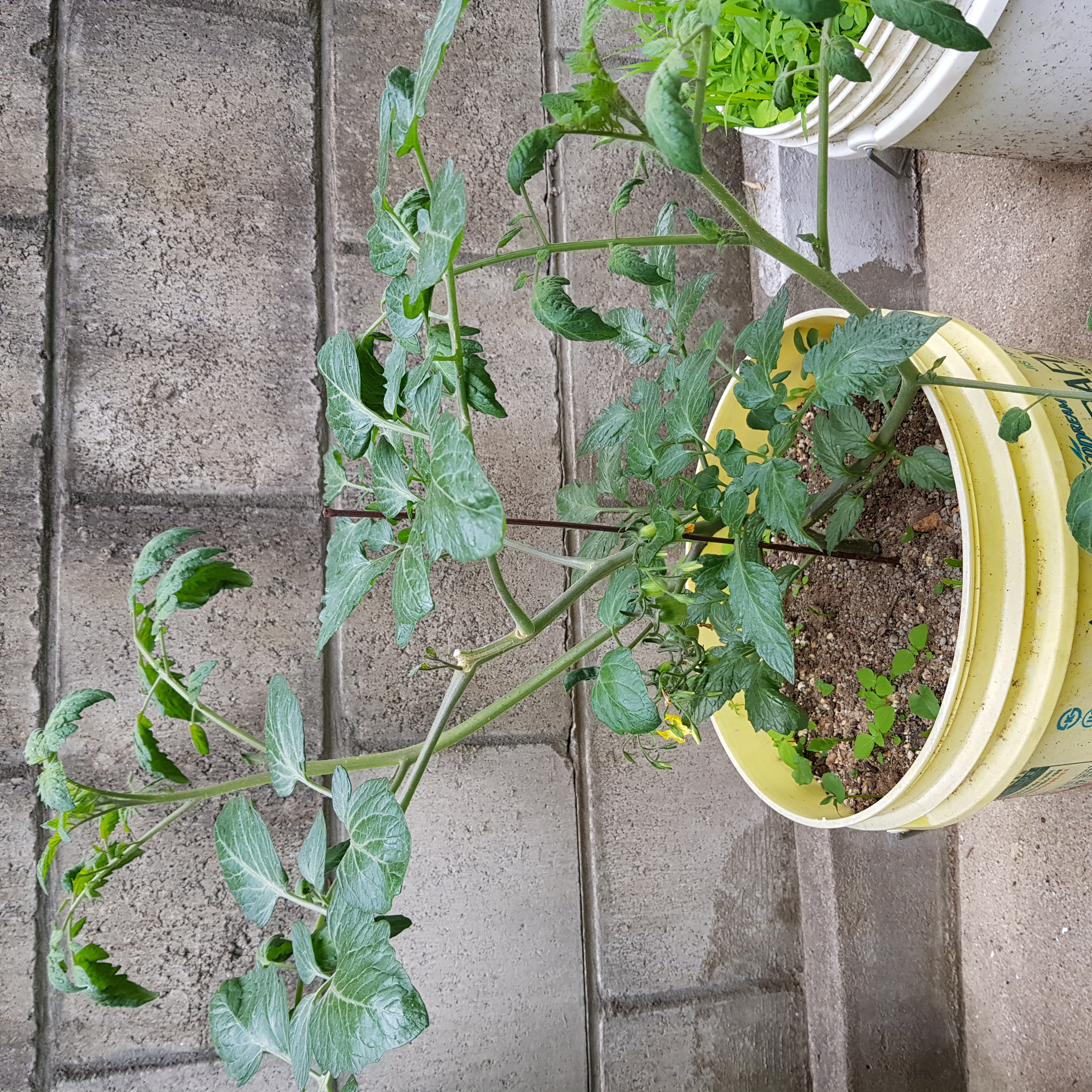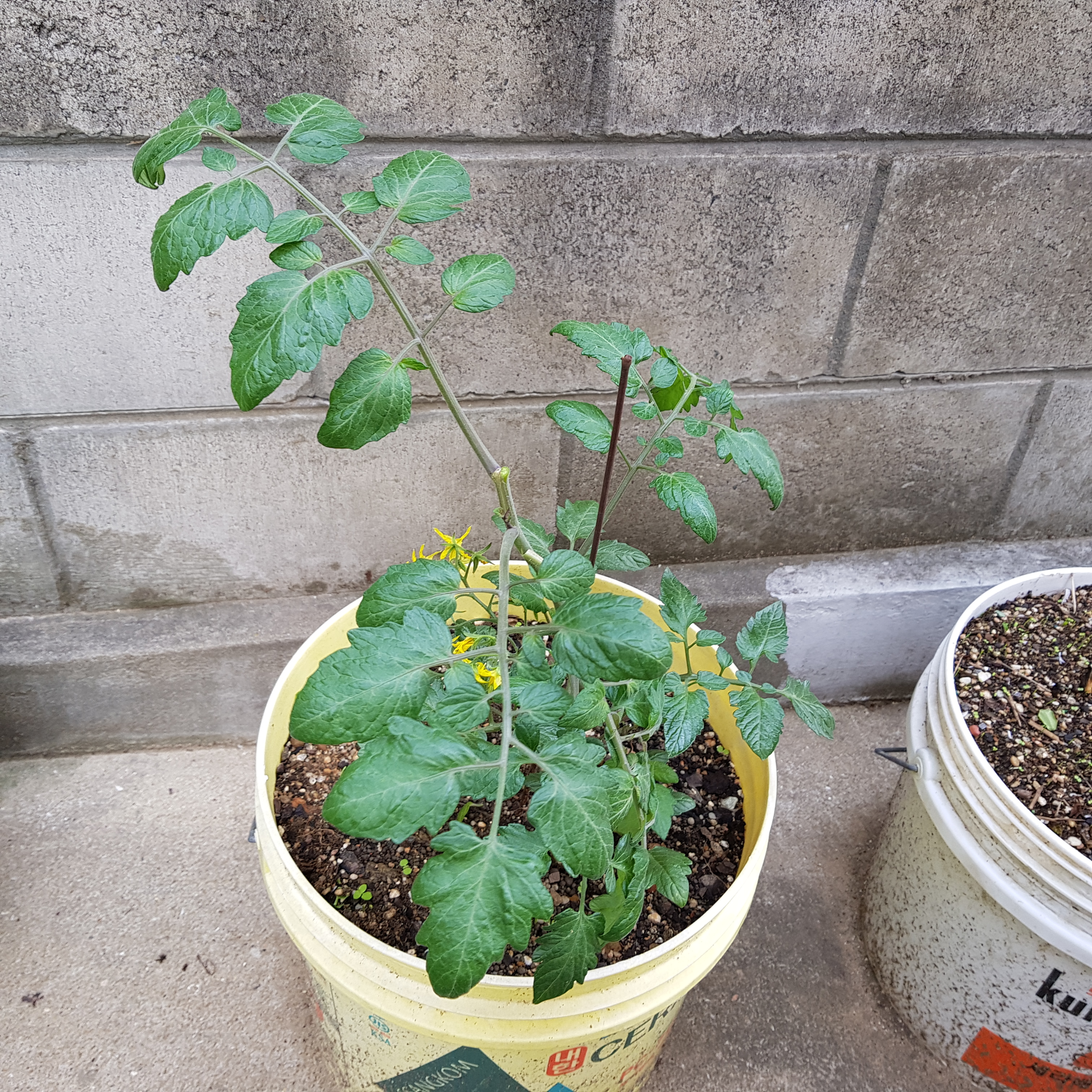 마스크 고무줄로 지지대에 고정했다. 지난번에 곁순 따고 지지대만 세워서 토마토 원줄기가 지지대에 기댈 수 있게 해 놨는데 바람이 많이 부니 토마토가 쓰러진다. 그리고 자꾸 토마토 가지들이 옆으로 누워 버린다. 지지대를 더 세워서 고정해 줘야 될 것 같다.