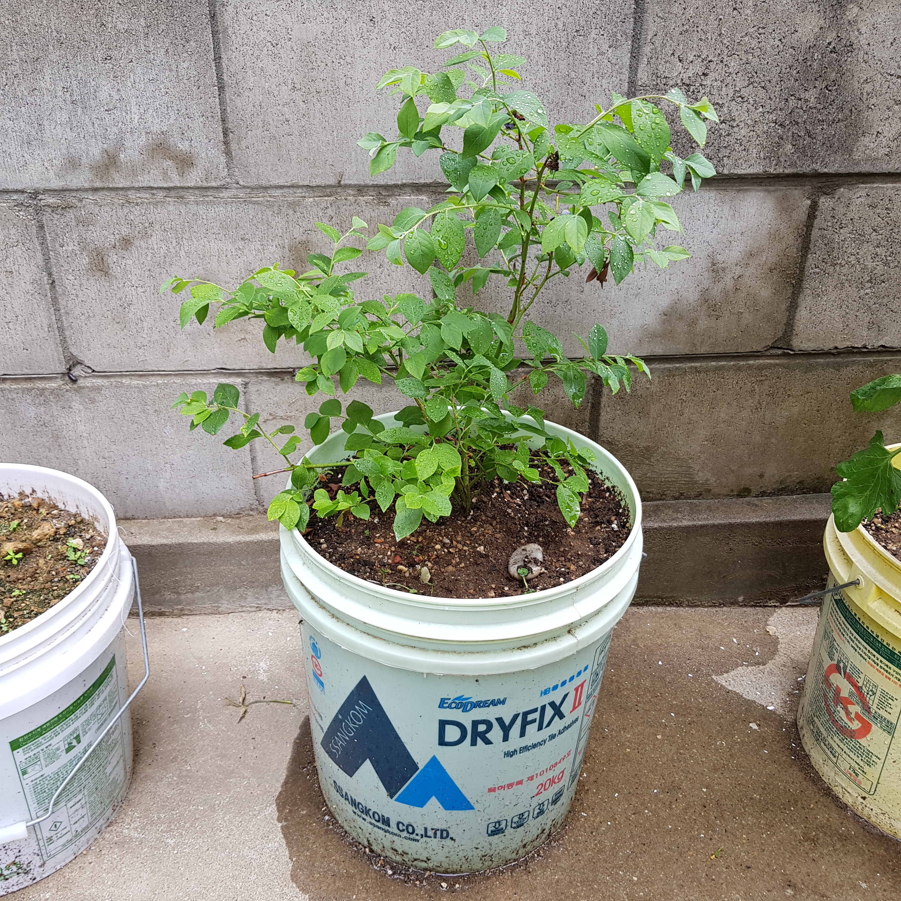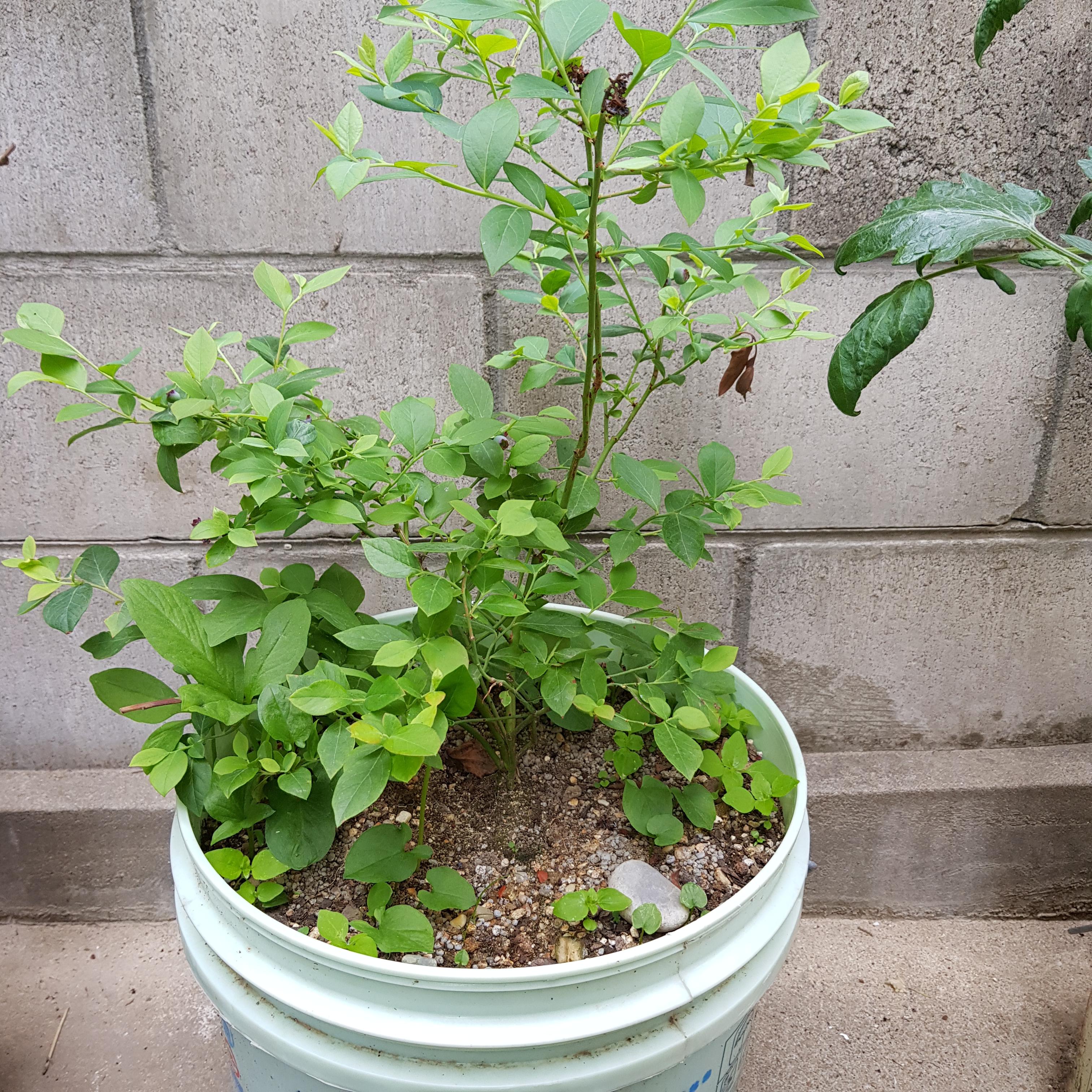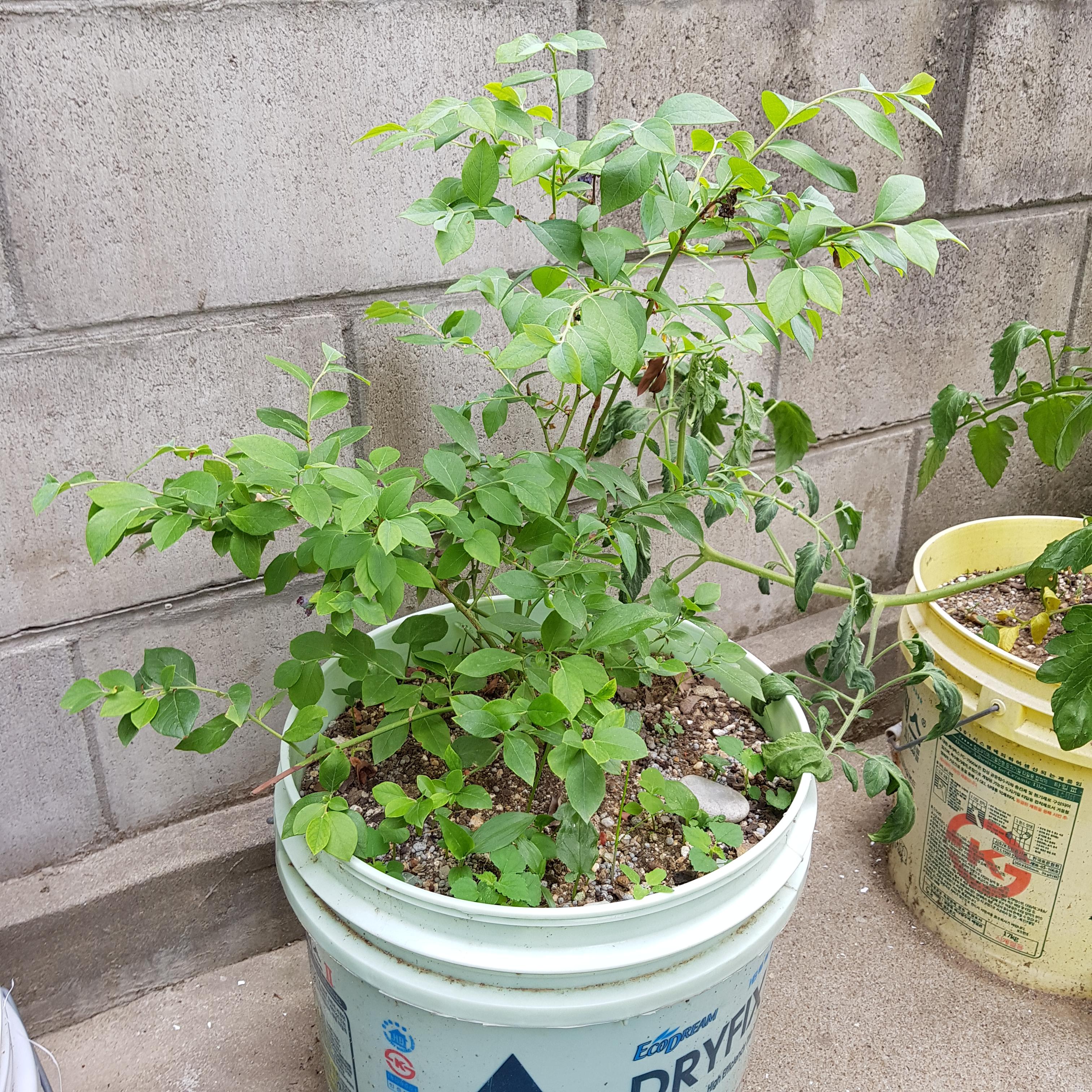 6월 17일. 보름 동안 블루베리 사진이 없다. 옆에 있는 토마토가 블루베리 묘목 쪽으로 넘어져서 블루베리 영역을 침범했다.