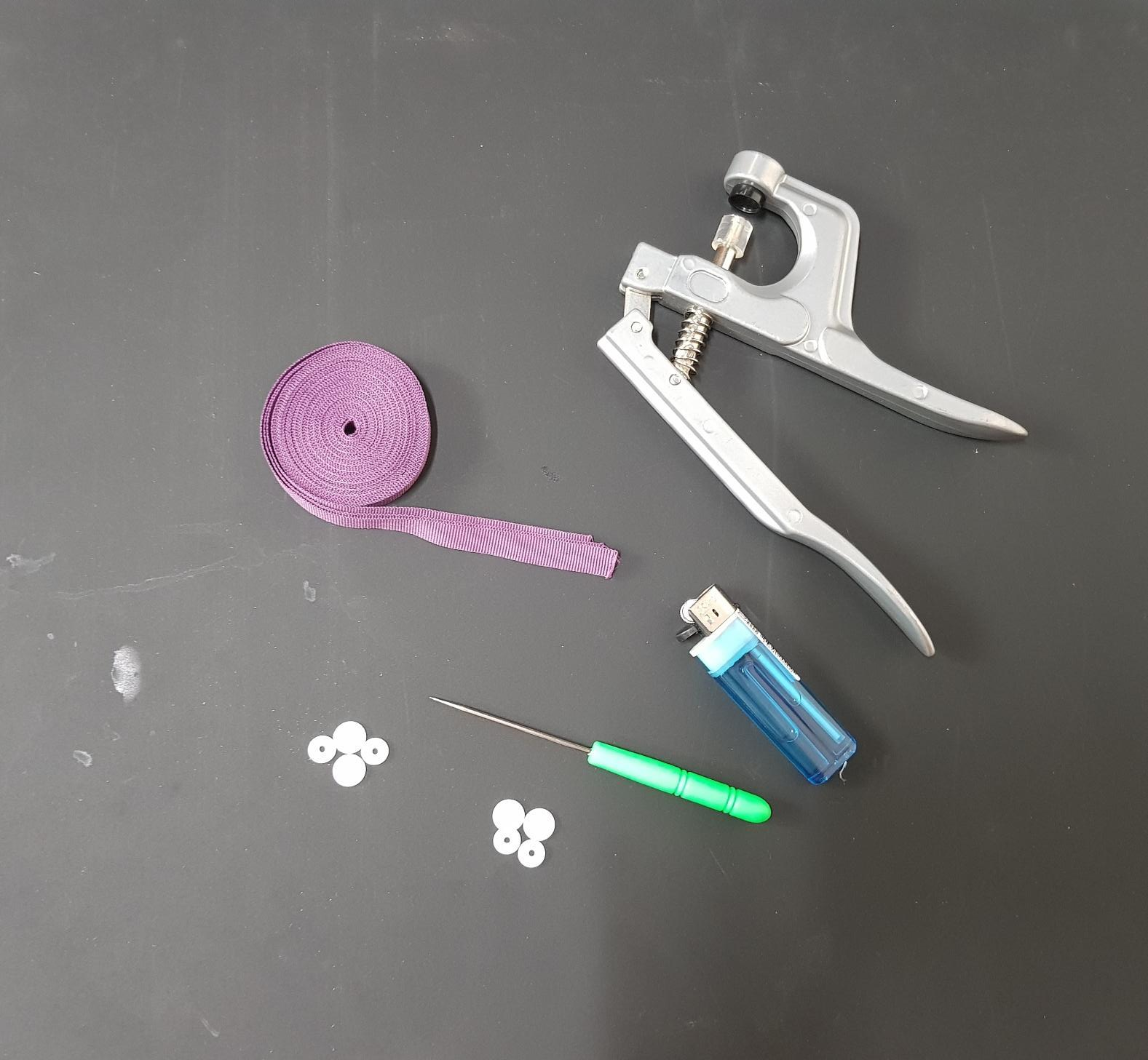 스트랩, 똑딱이 단추 2세트, 똑딱이 단추 다는 기구, 송곳, 라이터. 모두 집에 있는 재료를 이용했다. 스트랩은 구매한 건 아니고 예~~~~~전에 원단 구매할 때 원단을 묶었던 끈이다. 마스크 목걸이 스트랩으로 이용하기에 손색이 없다. 안 버리고 보관했더니 쓸 일이 생겼다. 역시 보관하길 잘했어!