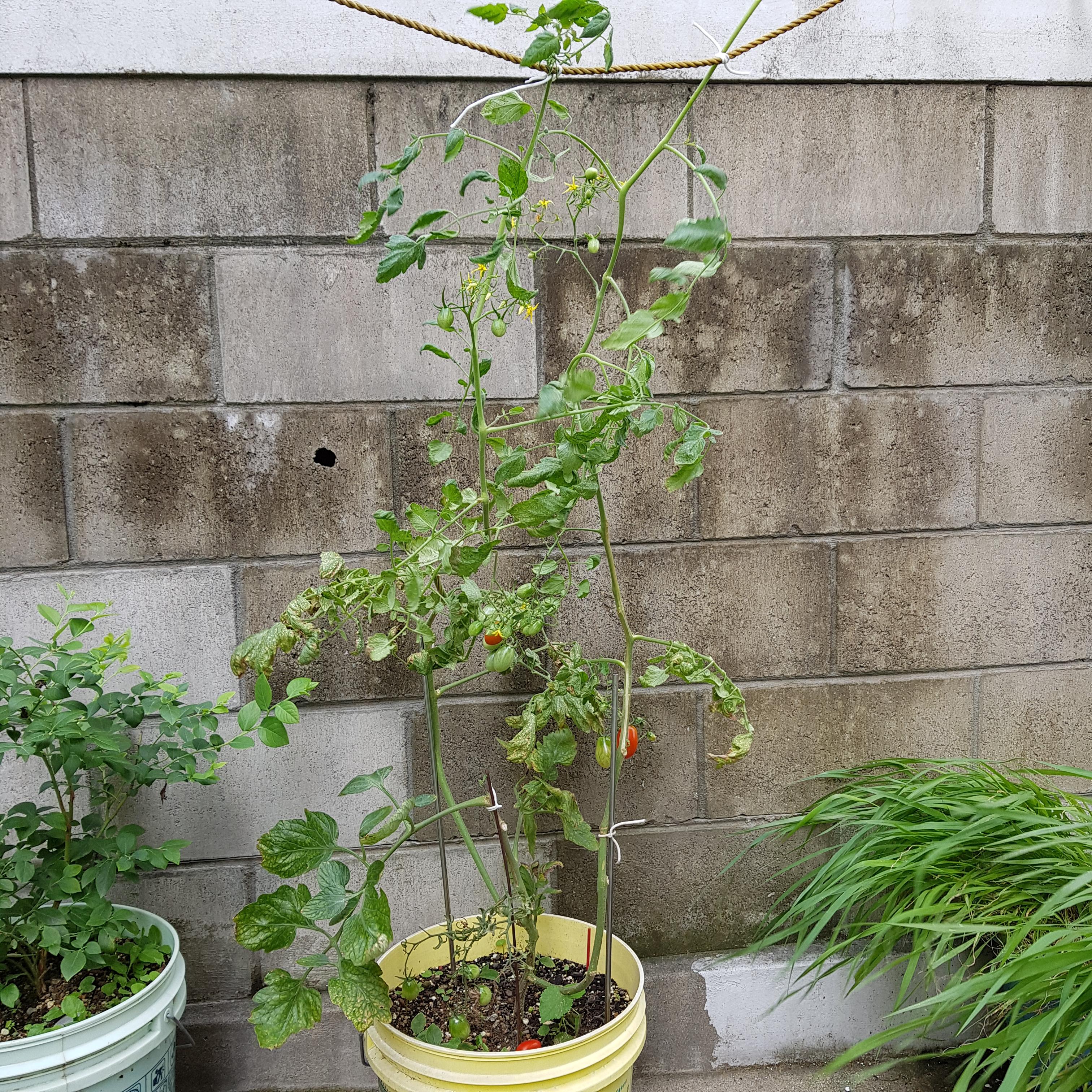 쓰러진 토마토를 일으켜 세우고 빨랫줄에 고정했다. 토마토 키가 150cm는 되는 거 같다.