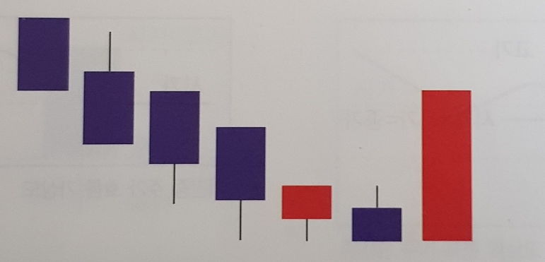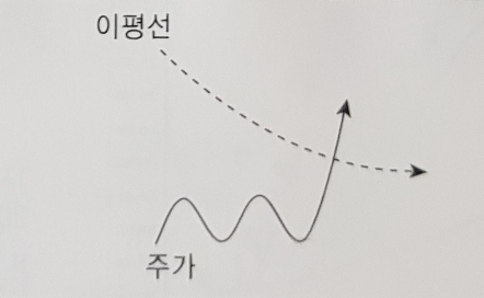 이평선이 하락하다 완만해져 가는 중에 주가가 이평선을 상향 돌파.
