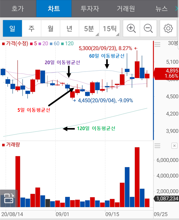 60일, 20일은 중단기.(20일 이평선을 가장 많이 이용)