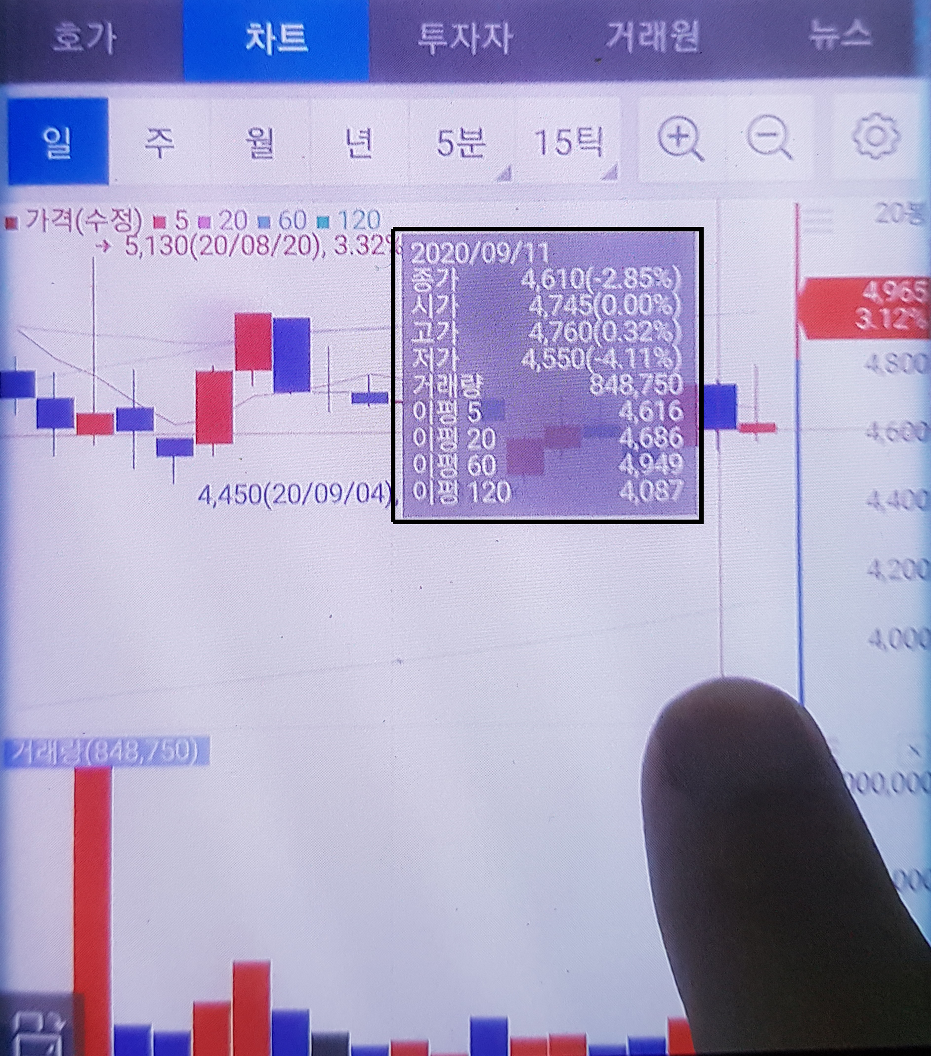 위의 일봉 차트를 보면 가격, 거래량을 알 수 있음. 하지만 정확한 가격과 거래량이 안보임.