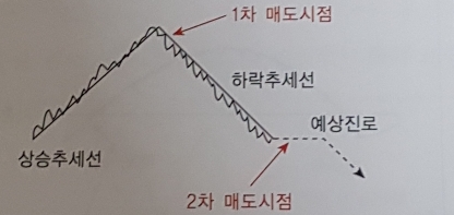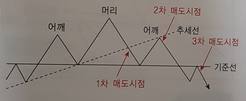 한국말 어렵다. 삼중천정형. 헤드앤숄더가 더 이해하기 쉽다. 3개의 고점이 머리와 어깨 같다고 해서 헤드앤숄더라고 부른다. 단기간에 생기는 패턴은 아니다. 꽤 오랜 시간에 걸쳐서 생기는 패턴이고 3차 매도 시점까지 가면 등신이라 부른다. 물론 희망과 기대감에 매도 버튼을 누르기 쉽지 않다. 그러나 헤드앤숄더 패턴은 어디까지 떨어질지 모른다. 매도가 답이다.