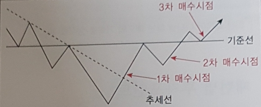 M과 반대의 모습을 하고 있는 W다. 두 번의 지지를 받아 상승하므로 전형적인 상승 패턴이다. W는 흔히 볼 수 있지만 갑자기 폭락하는 경우가 생긴다. 주린이는 무섭다. 항상 체결창을 예의주시 해야 한다.