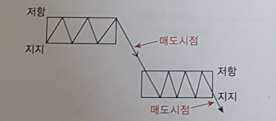 밑면이 수평인 게 특징이다. 수평선 하락 돌파시 튀어라. 추가 하락이 예상되는 패턴이다.