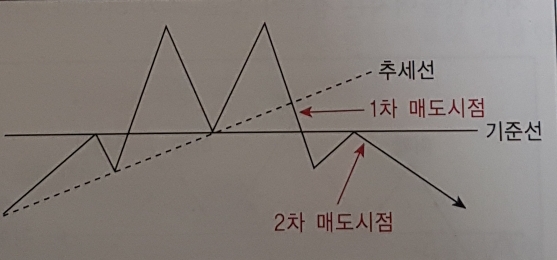 M자형도 전형적인 주가 하락의 패턴이다. 주가가 한번 더 고점에 오기를 기다리면 절대 오지 않는다. 그냥 폭락하는 경우가 더 많았다.