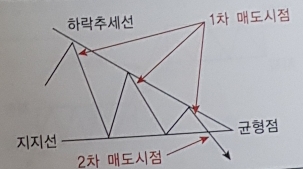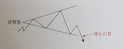 대칭삼각형과 반대다. 하향 이탈 시 폭락이 예상되므로 매도.