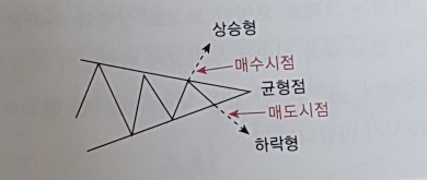 고점은 하락하고 저점은 상승하면서 생기는 삼각형이다. 상향 이탈 시 매수, 하향 이탈시 매도한다.