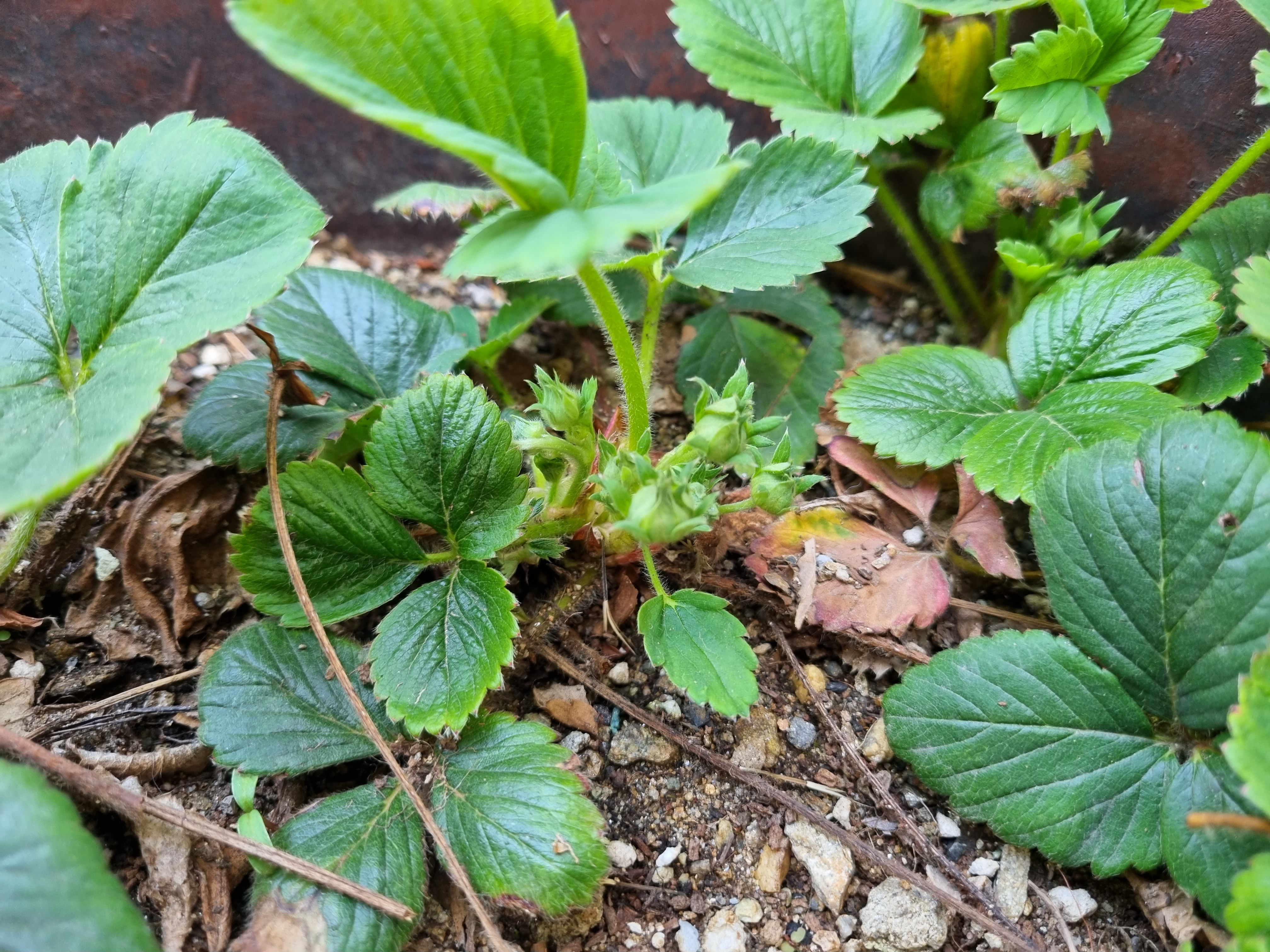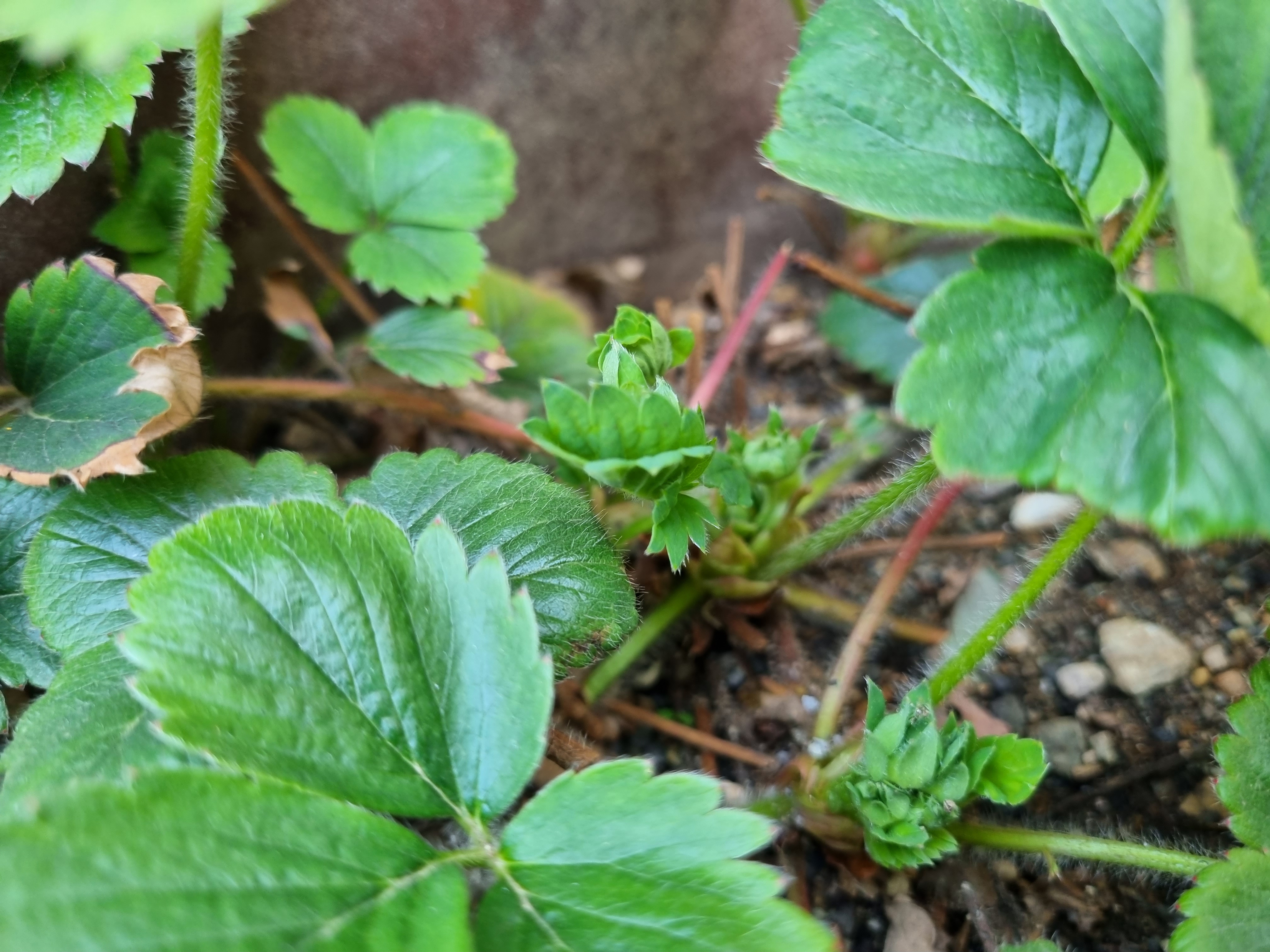 아직 딸기 꽃이 핀것도 아니고 몽우리가 보이는 정도.