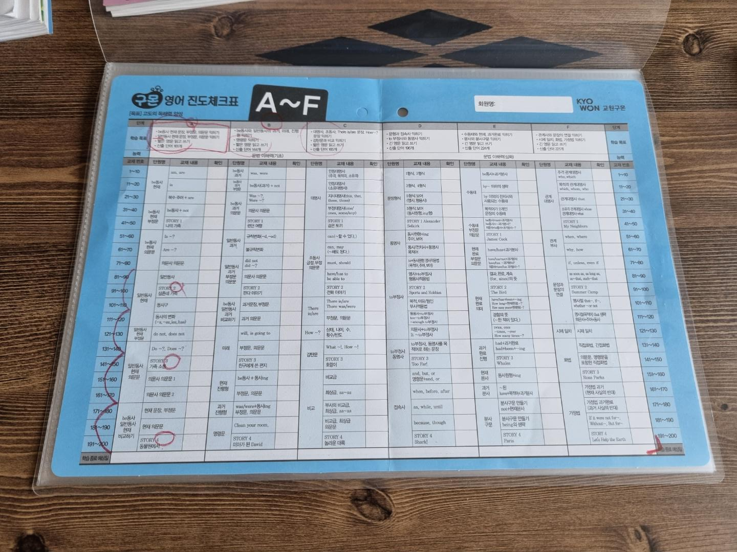그리고 위의 사진과 같이 진도 체크표를 주신다. A~F 까지가 초등학교 6학년이면 끝난다고 하셨다. 헐ㅡㅡ;; 요즘 초등학생 머리가 참 좋은가보다. 아무튼 A단계가 끝나는 날 테스트를 한다고 한다. 혼자 하는 것보다 훨씬 재밌고 좋다. 누군가가 나의 레벨을 체크해주고 숙제를 검사해 준다는 것이 너무 감사한 일이다. 아~ 학교 다닐 땐 몰랐는데...