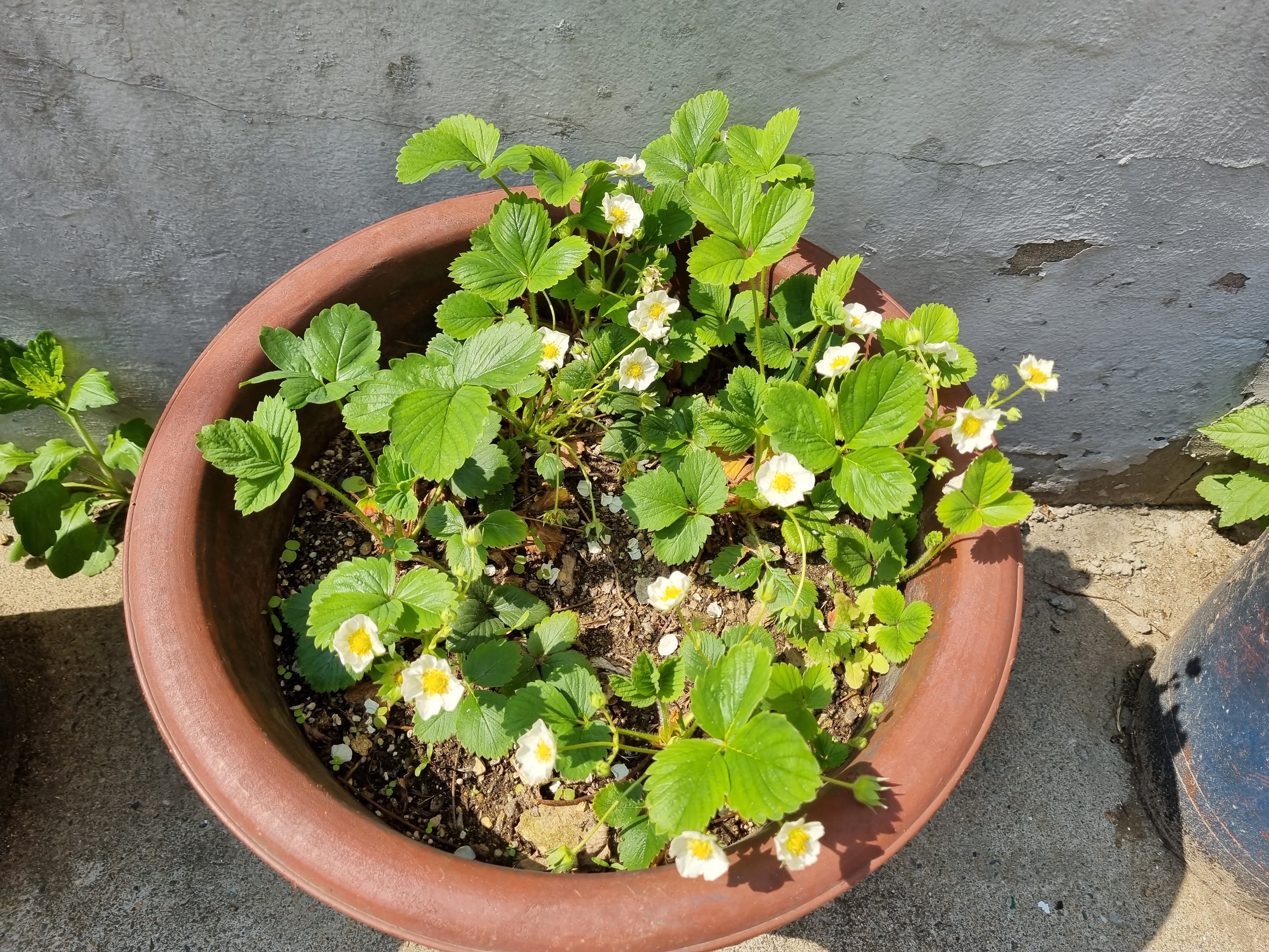 큰 화분 딸기에서 더 많은 꽃이 피었다.