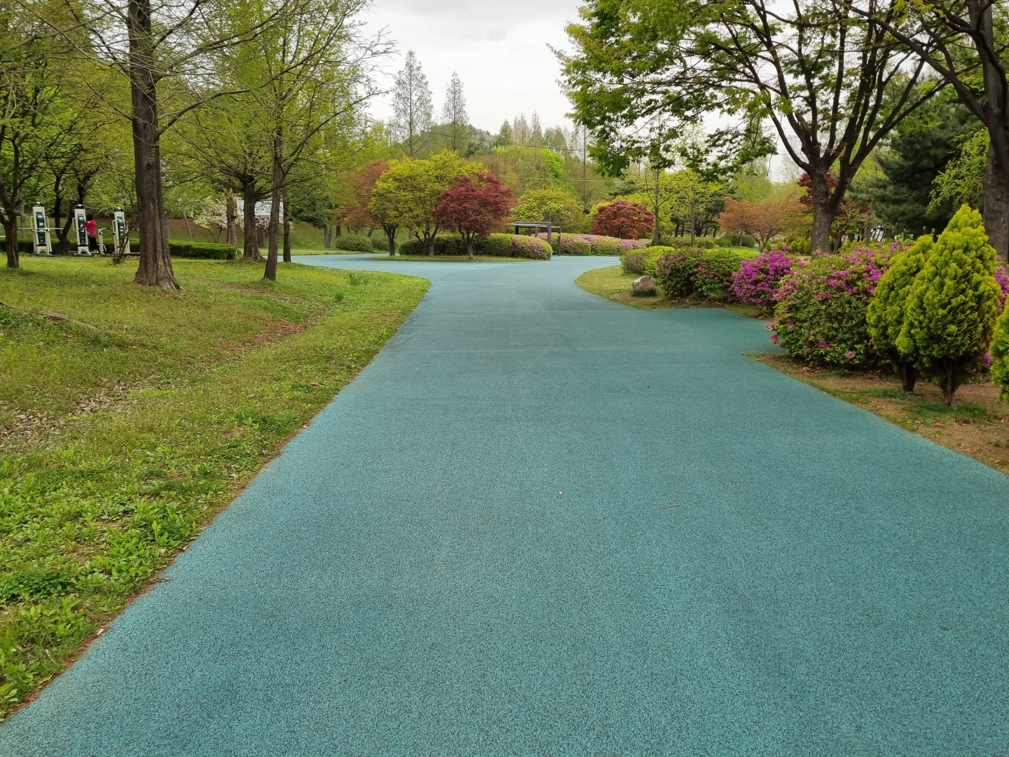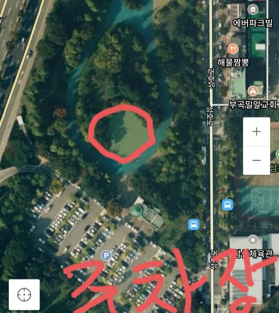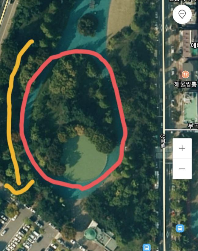 이제 인라인 스케이트장 밖에서 인라인을 타봤다. 위의 위성사진에서 빨간색 동그라미 부분을 반시계 방향으로 한 바퀴 돌았다. 노란색 화살표로 표시된 부분은 약간 경사가 있다. 올라오는데 힘들다. 아주 아주 미세한 경사임에도 엄청 힘들었다.