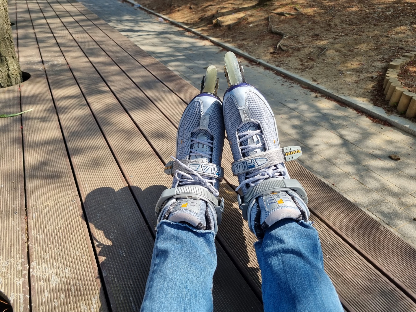 지난 글에서 발등에 있는 스트랩(찍찍이) 잘라 버리고 싶다고 했는데 절대로 자르면 안 된다. 인라인이 발에 딱 붙어야 연습하기 편하다. 발목 흔들리고 발등이 인라인에 딱 안 붙으면 인라인이 헐렁거려서 연습하는데 다리에 더 많은 힘이 들어간다. 차라리 조금 아플 정도로 꽉 조여서 신는 게 낫다.