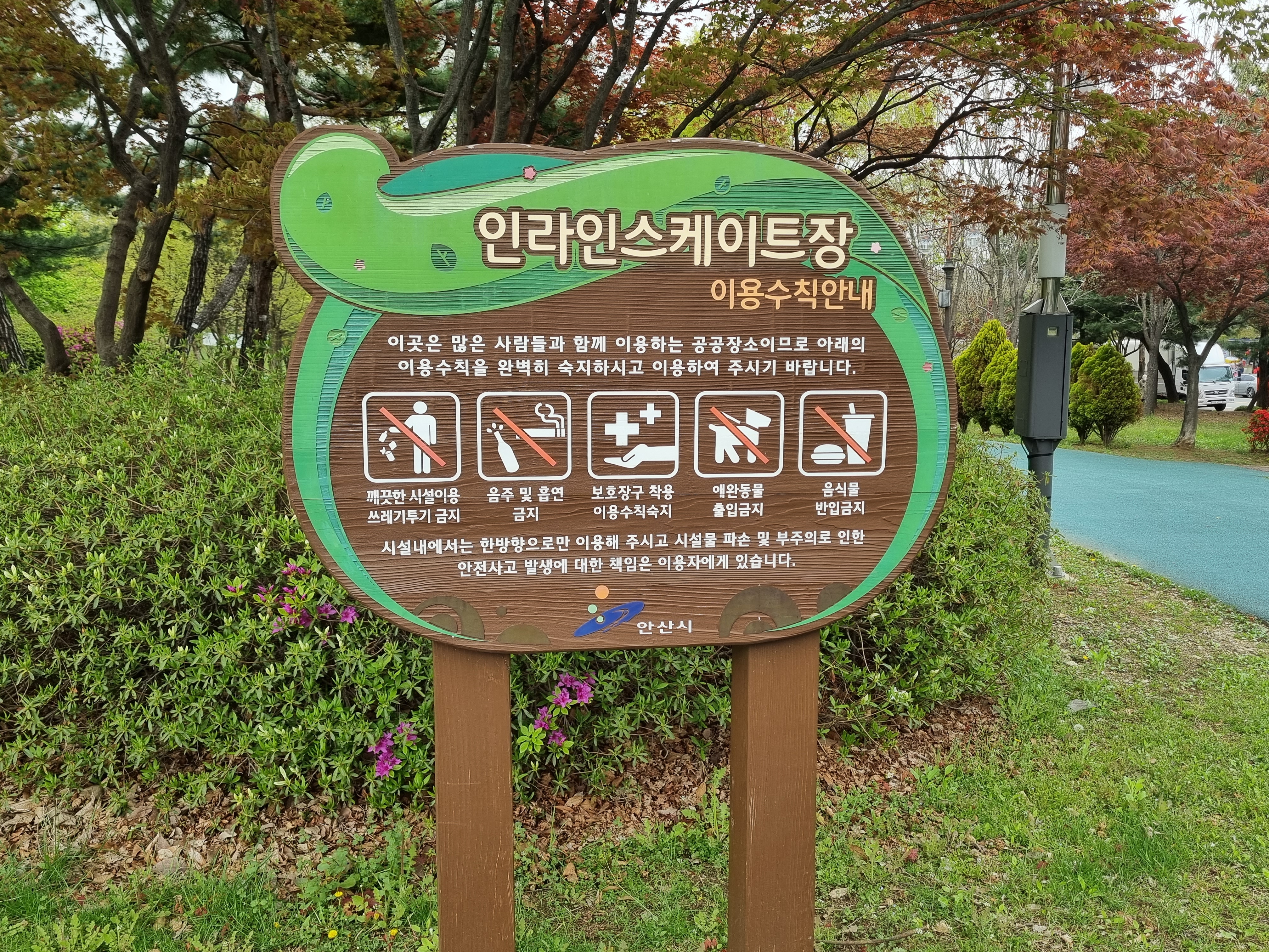 정확히 딱 인라인 스케이트장 이라고 표지판이 있다. 이런 공원 너무 좋다. 쓰레기 투기 금지, 음주 및 흡연 금지, 보호장구 착용, 애완동물 출입금지, 음식물 반입금지. 이 정도 이용수칙은 기본이지.
