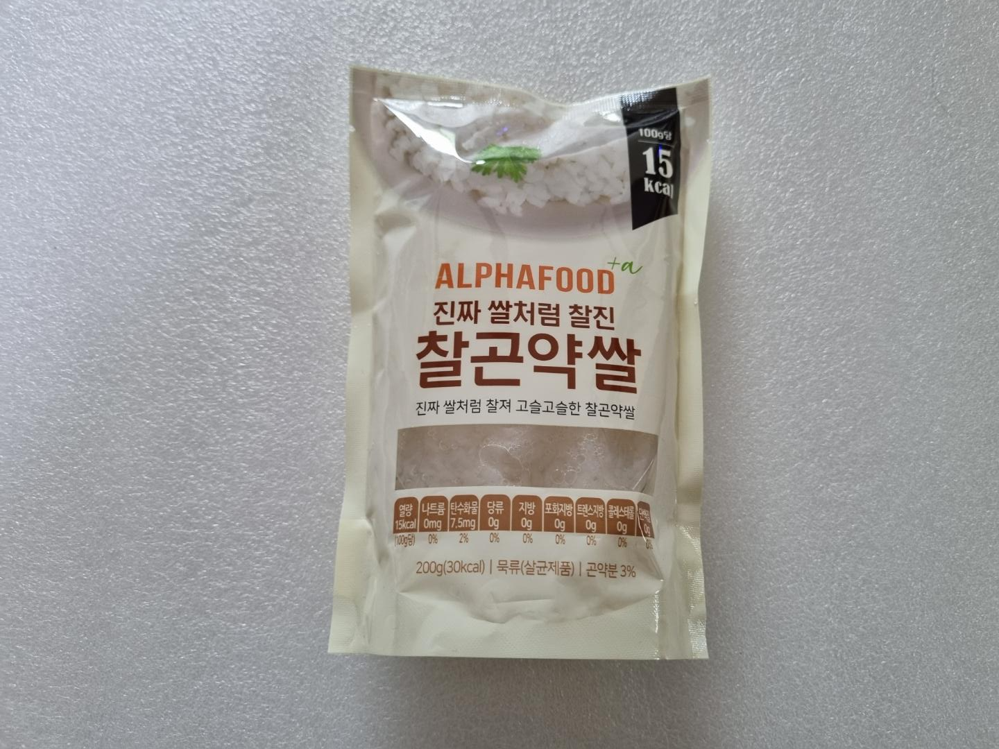알파푸드 진짜 쌀처럼 찰진 찰곤약쌀. 칼로리가 100g당 15Kcal 밖에 되지 않는다. 한 공기(200g) 먹어도 30Kcal다. 백미 한 공기(200g)는 300Kcal다. 백미보다 찰곤약쌀이 훨씬 낫다고 생각한다.