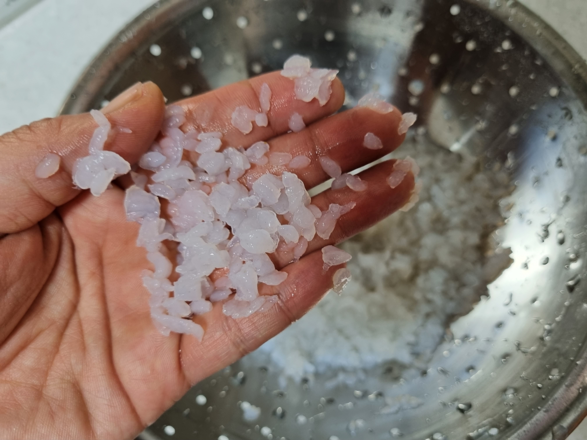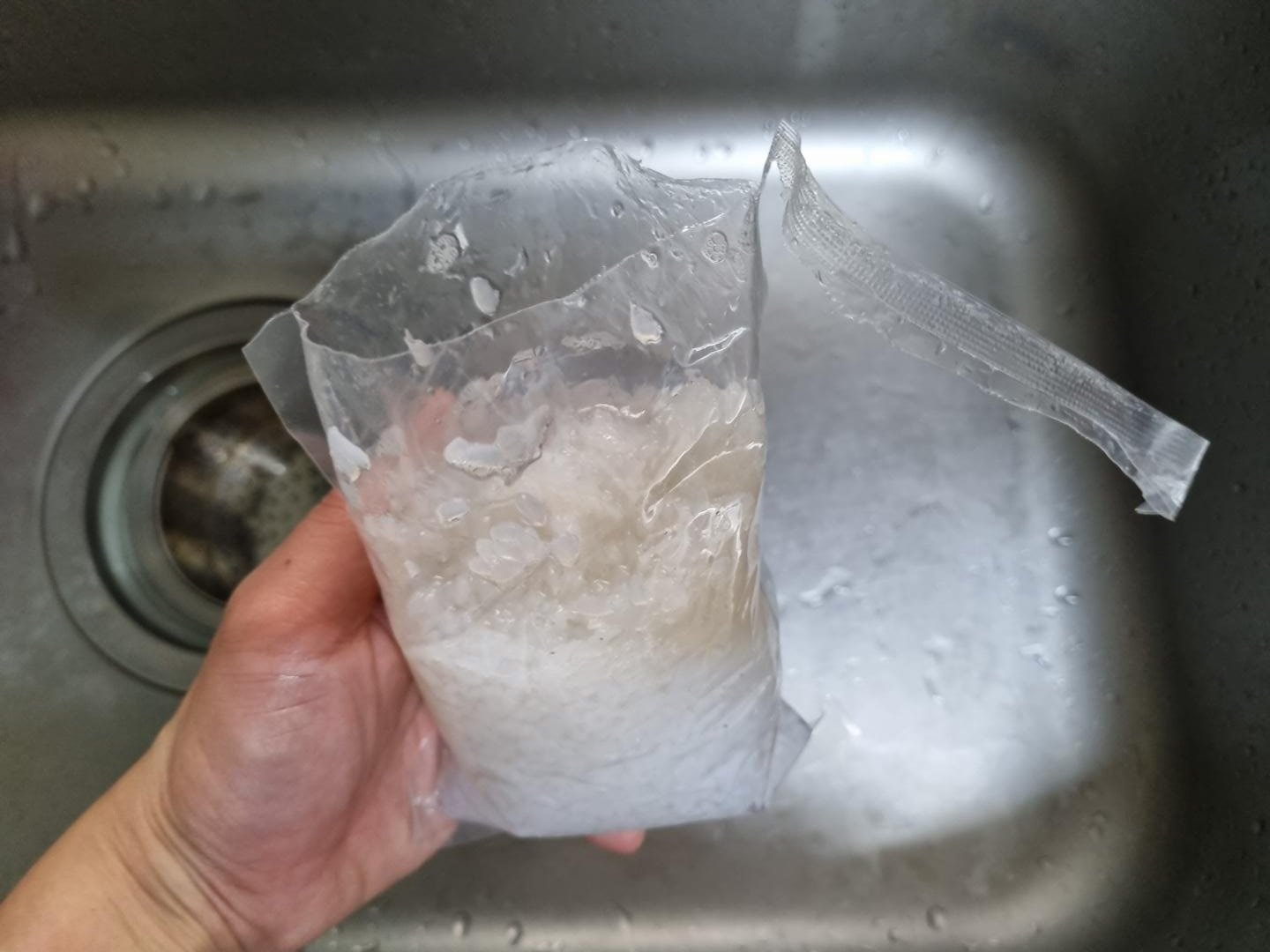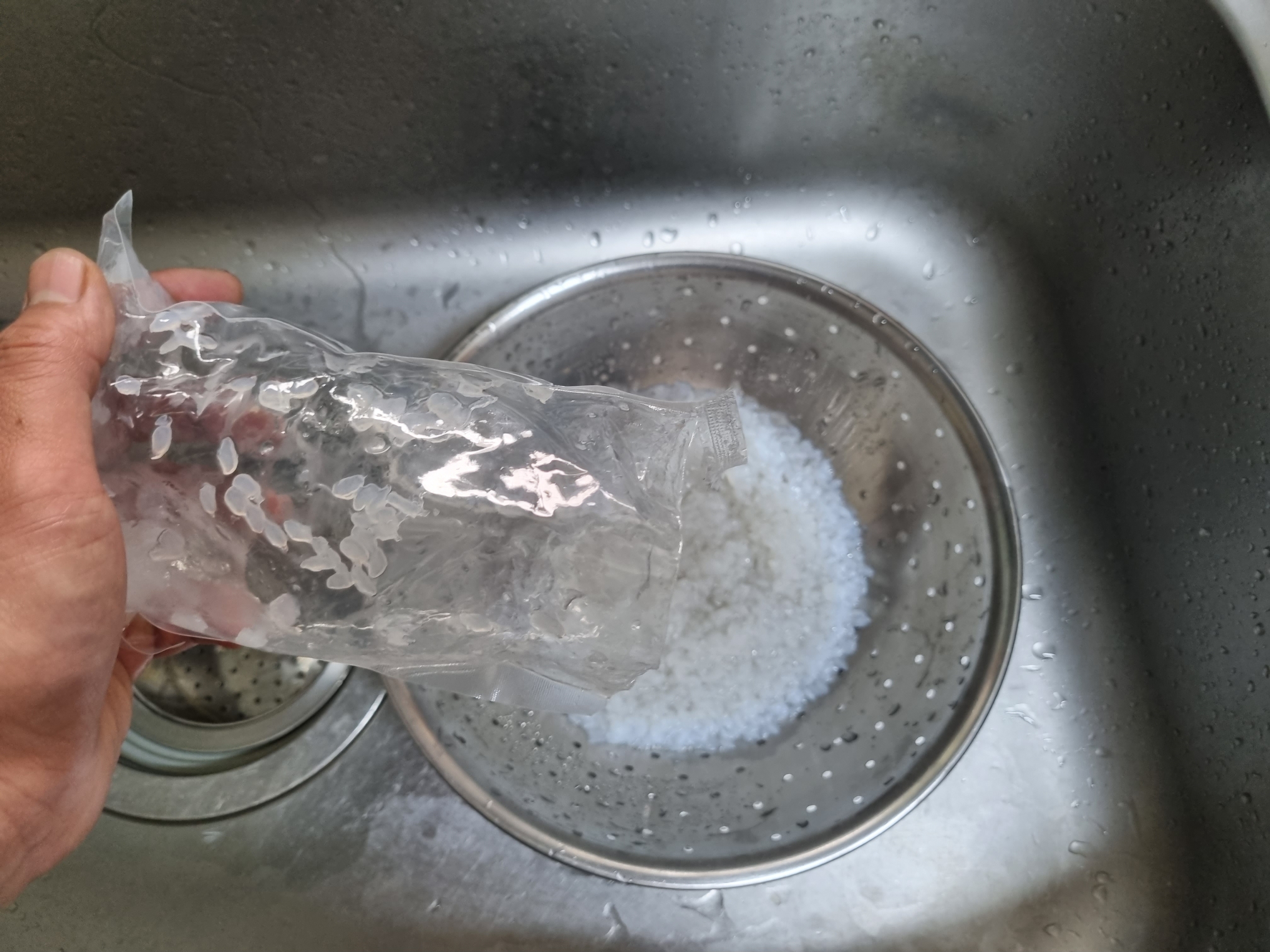 채반에 쏟아서 곤약쌀 보존수를 버린다. 포장된 봉지에 몇 개의 곤약쌀이 남는다.