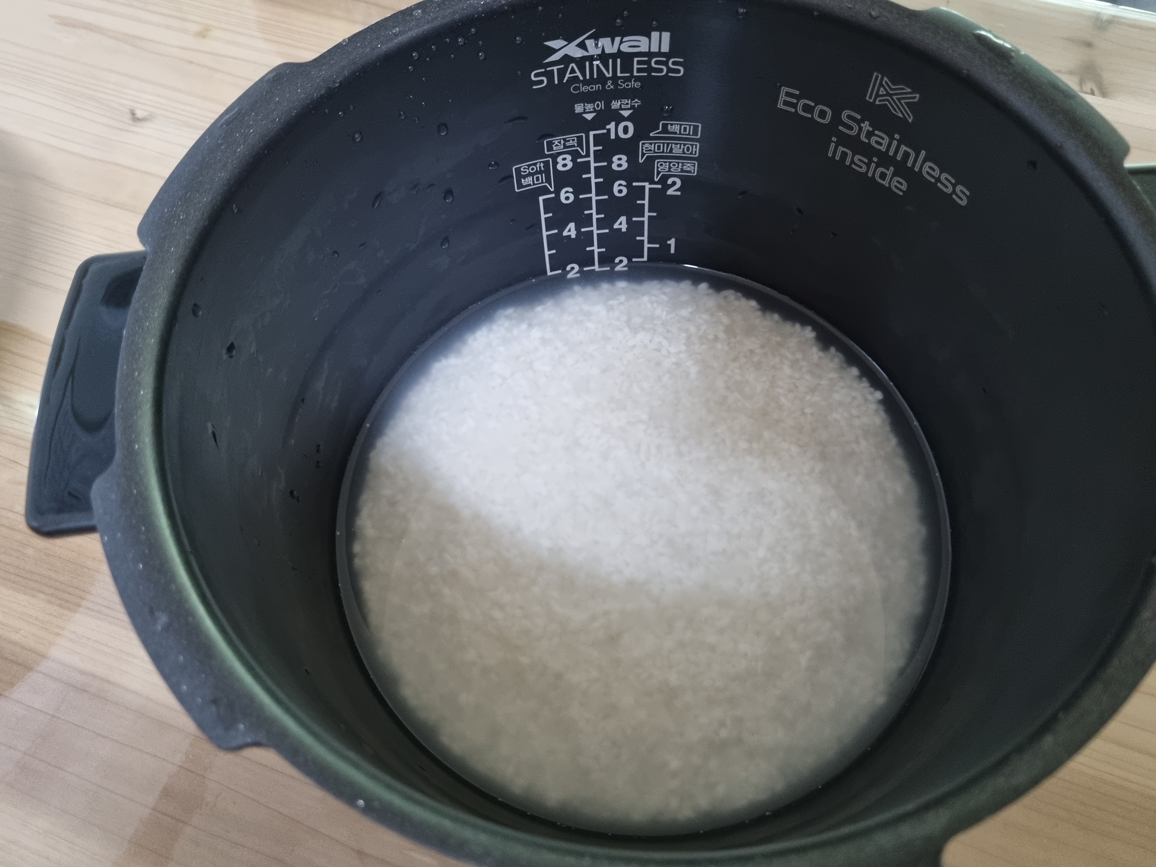 위 사진은 백미 2인분을 씻어서 물의 양까지 맞춘 상태다. 쌀 2인분, 물의 양도 2인분이다. 꼭 곤약쌀을 넣기 전에 물의 양을 맞춰야 한다.