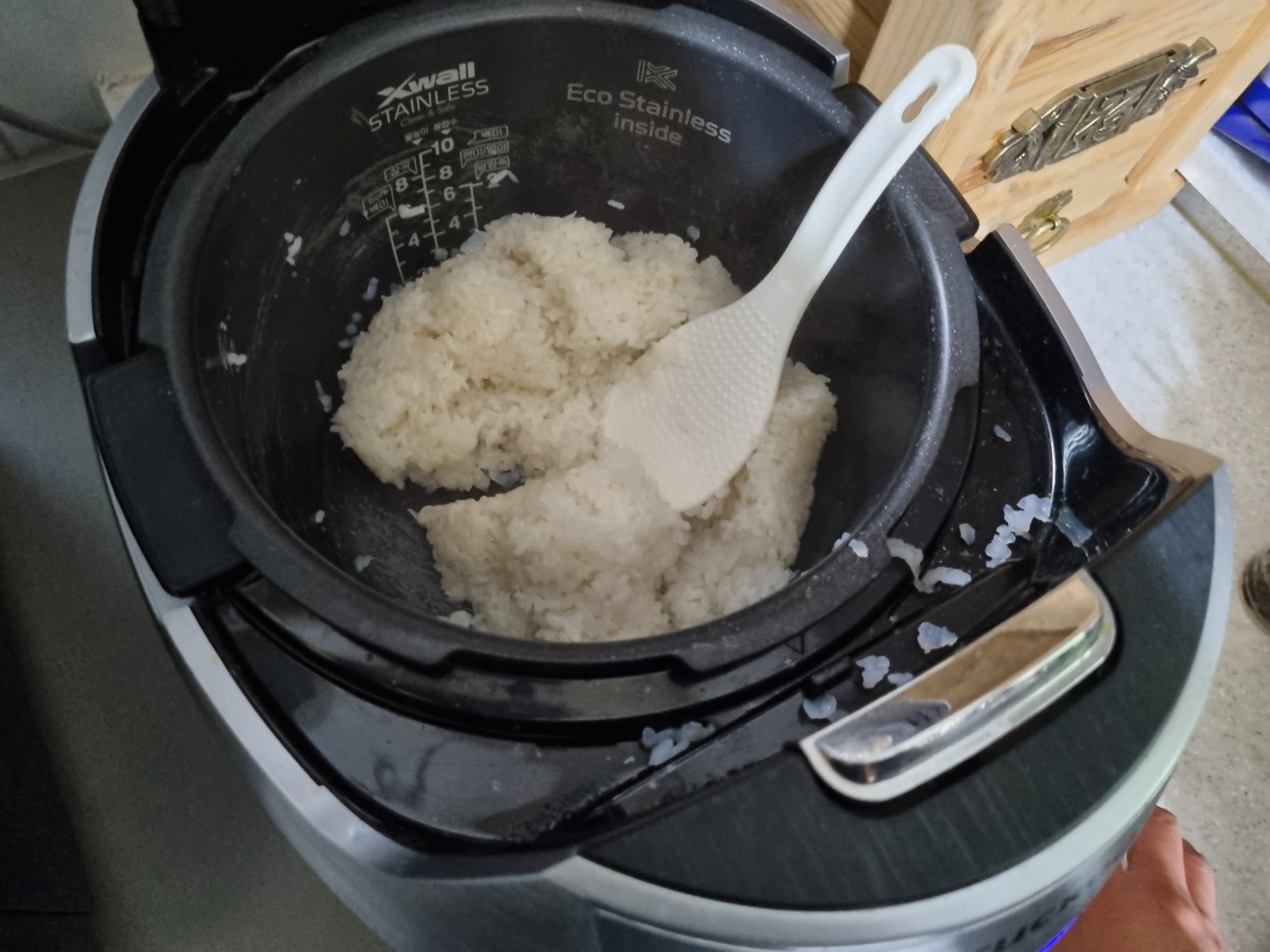 취사가 완료되고 10분이 지난 후에 밥을 잘 섞어 준다. 너무 방정맞게 주걱을 휘둘렀더니 곤약쌀이 사방팔방 튀였다.