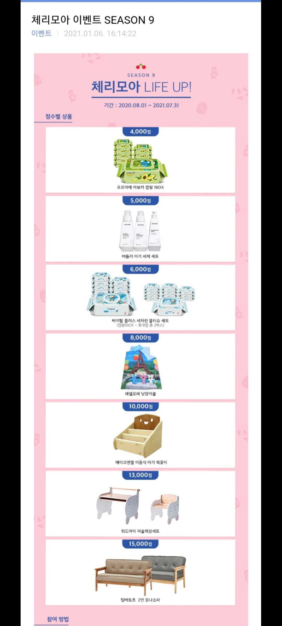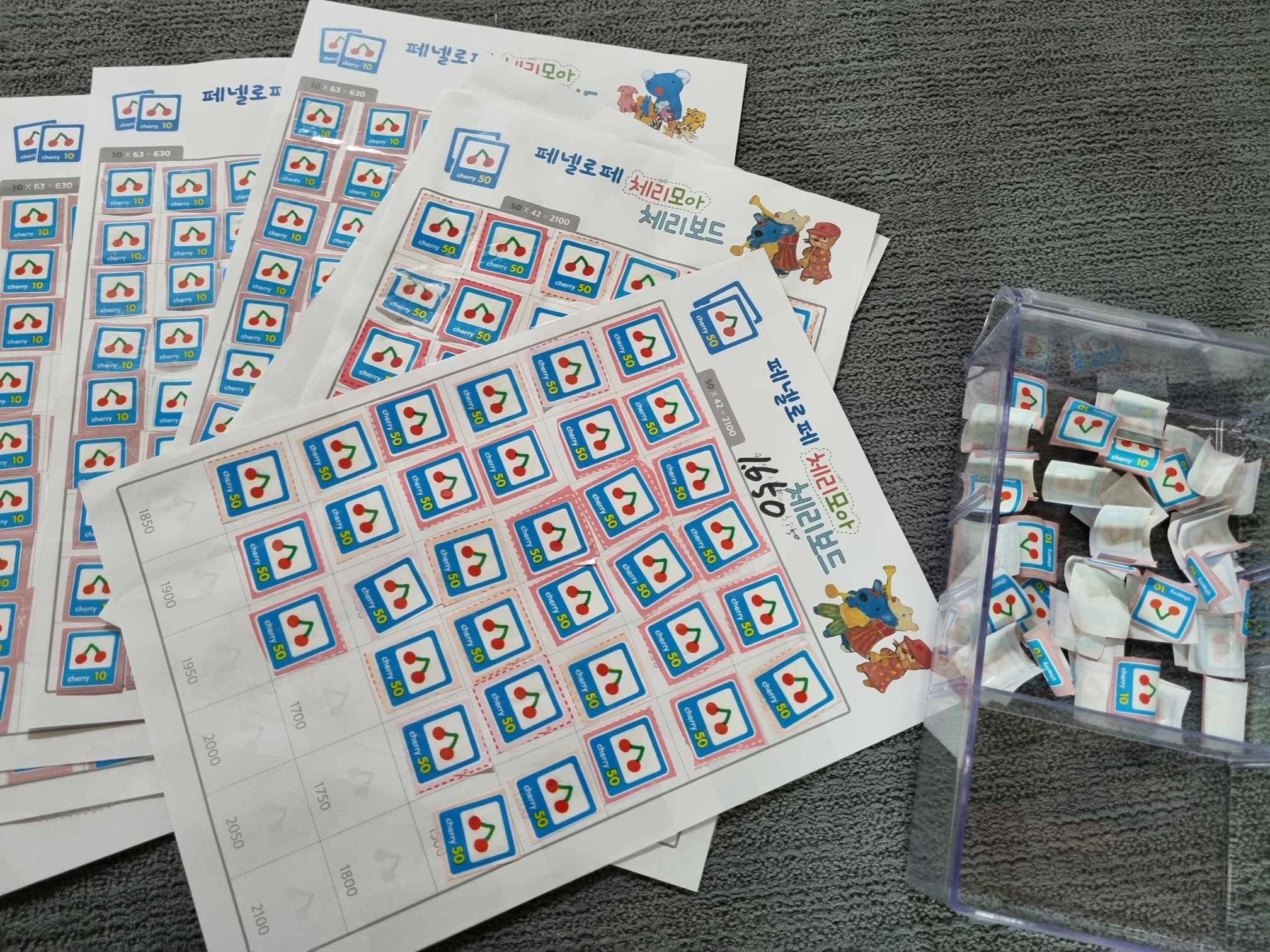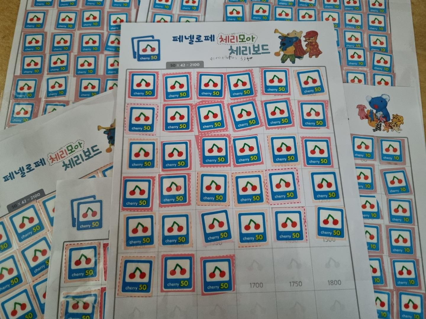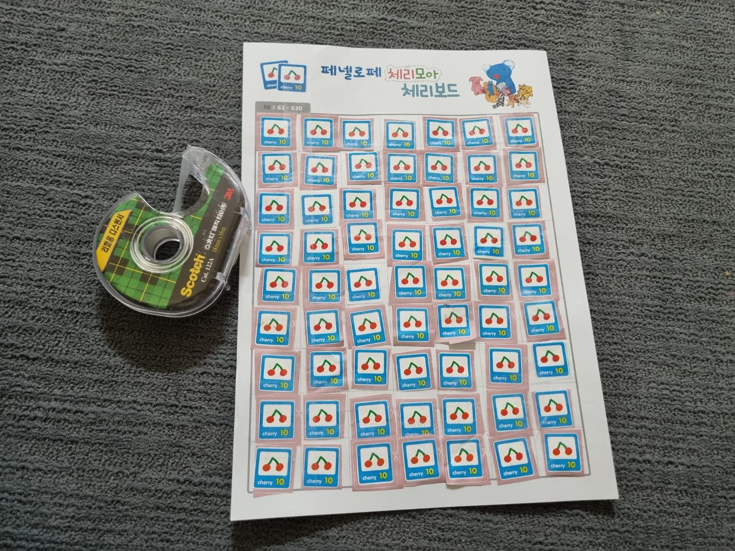 아이와 함께 열심히 체리 포인트를 모았다. 거의 4~5년 모은 거 같다. 금방 모을 줄 알았는데 생각보다 오래 걸렸다. 그냥 버린 물티슈 봉지도 있고 처음엔 모으지 않아서 그냥 버린 체리 포인트도 많다.