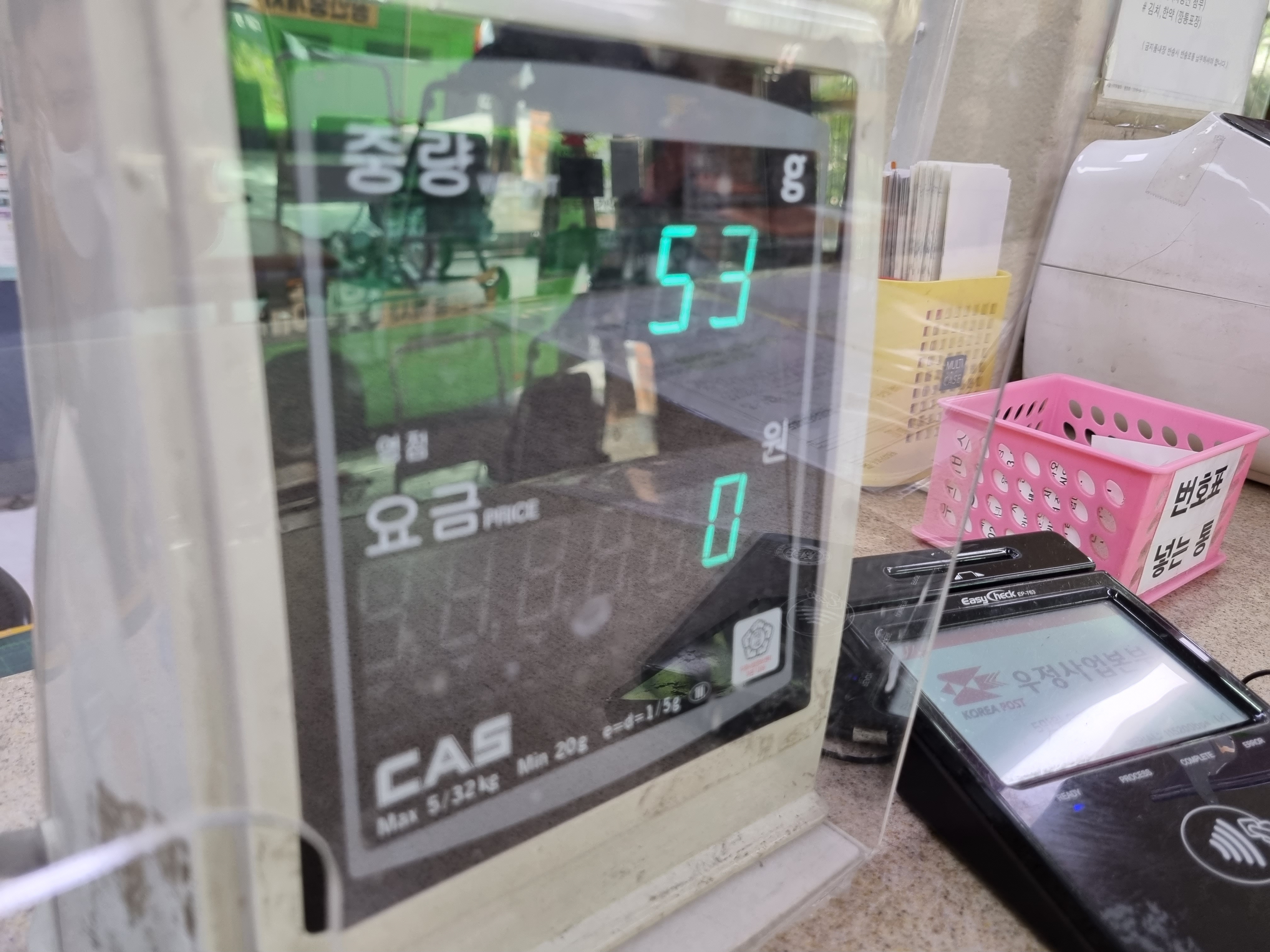 등기 우편을 보내기 위해 무게를 잰다. 53g.