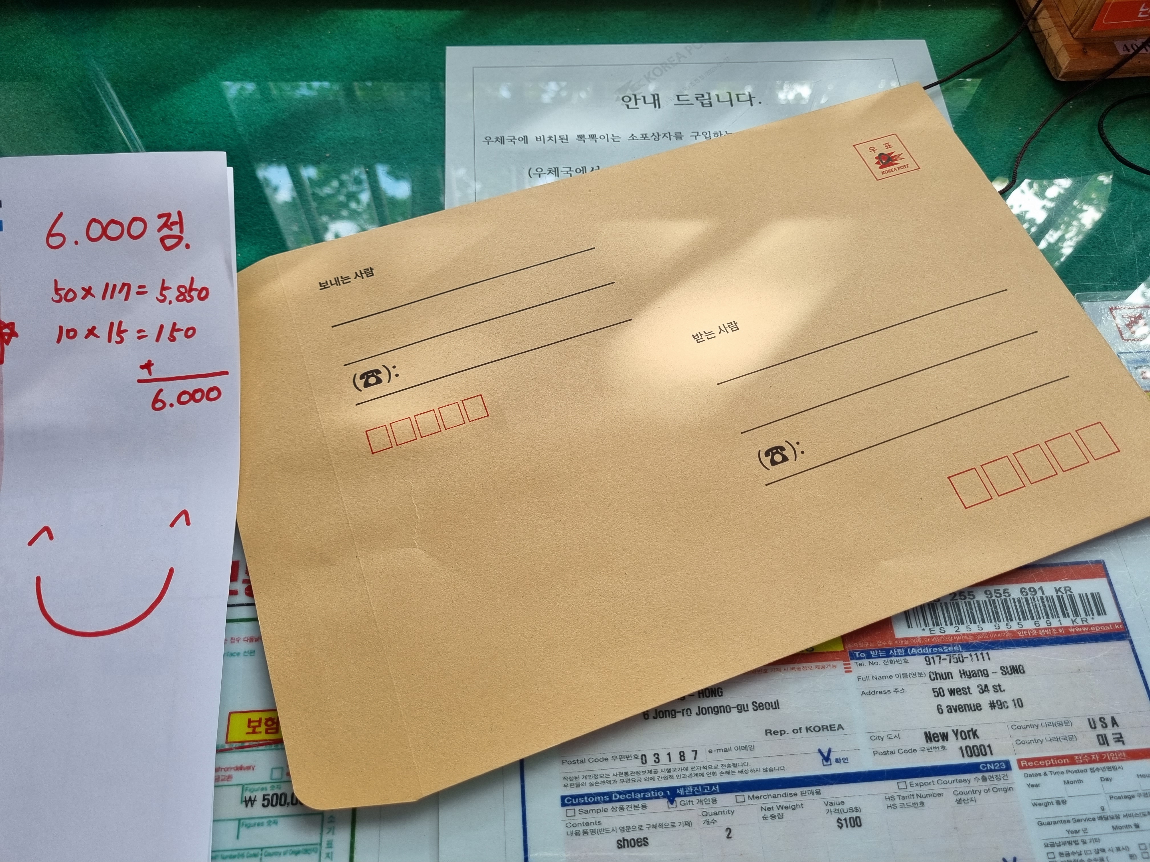 우체국 아저씨: 월요일에 들어가요.(보내는 날은 금요일)