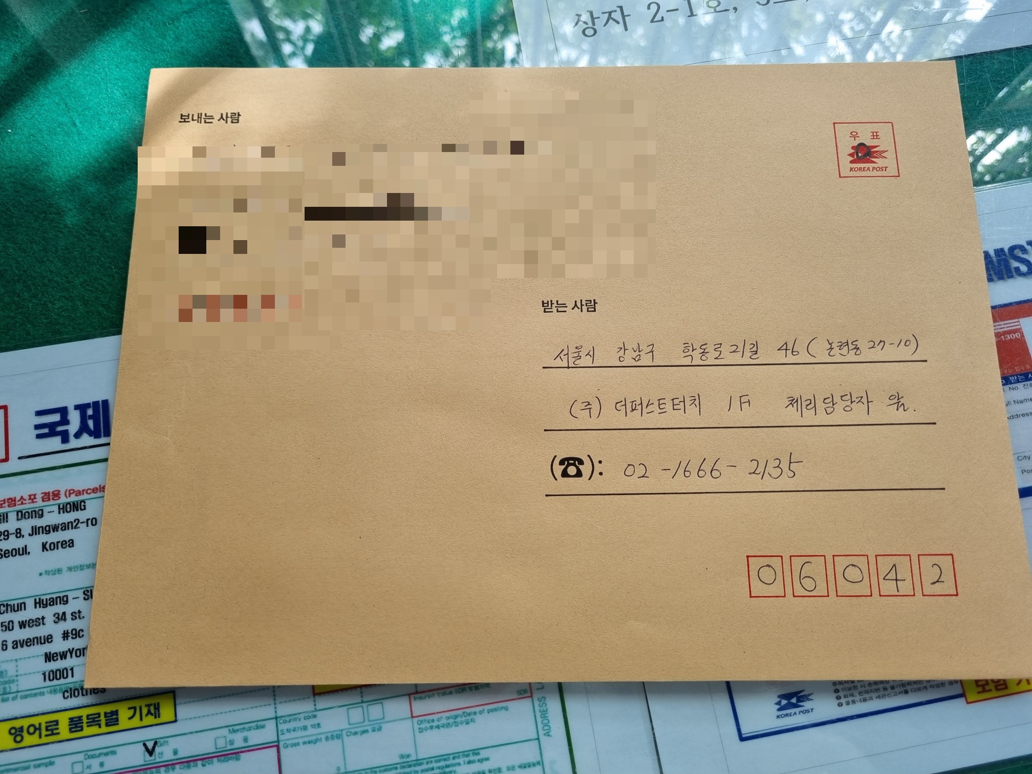 주소를 적는다. 서울시 강남구 학동로 21길 46.(논현동 27-10) (주)더퍼스트터치 체리 담당자 앞. 02)1666-2135. (우)06042