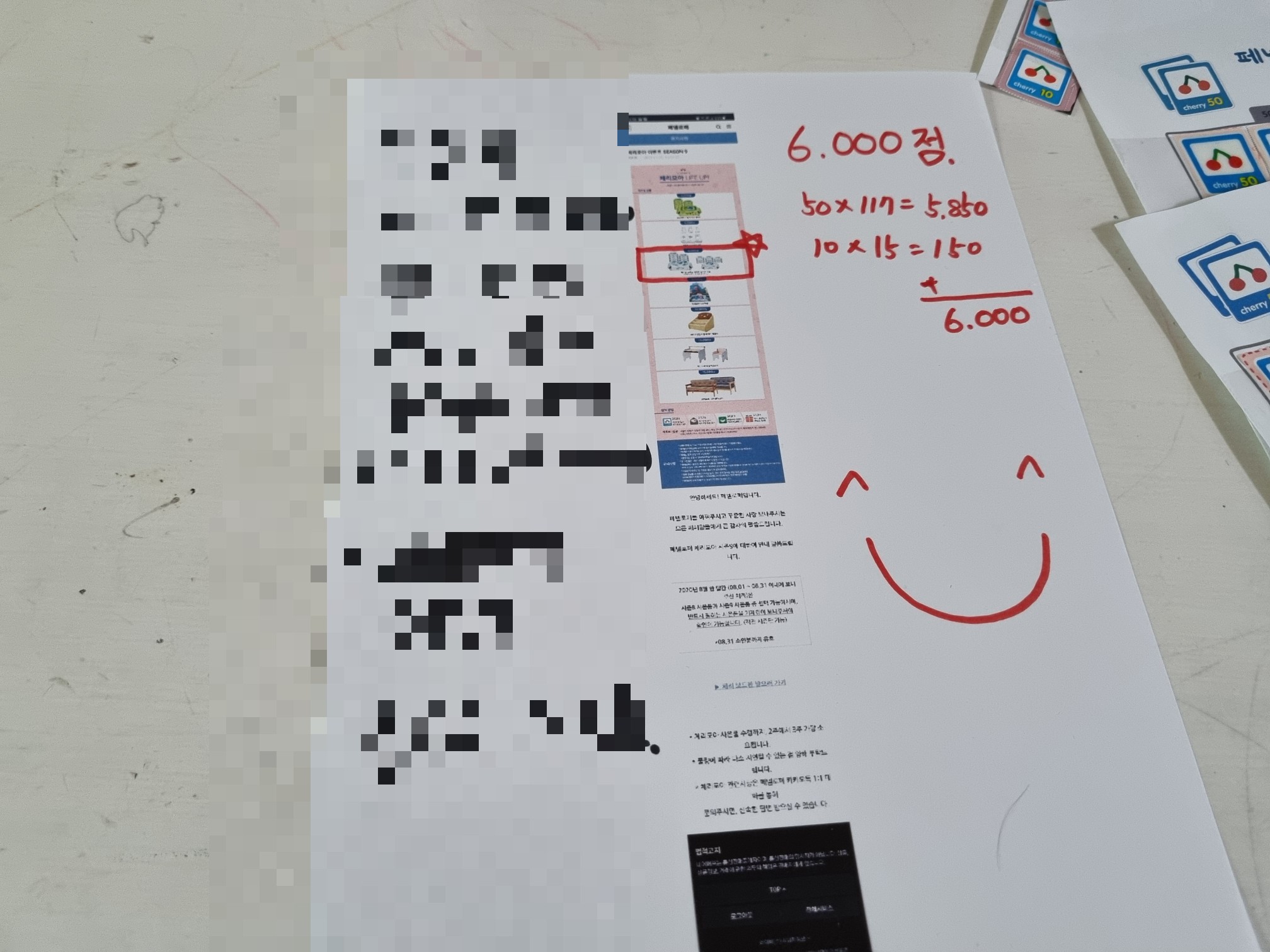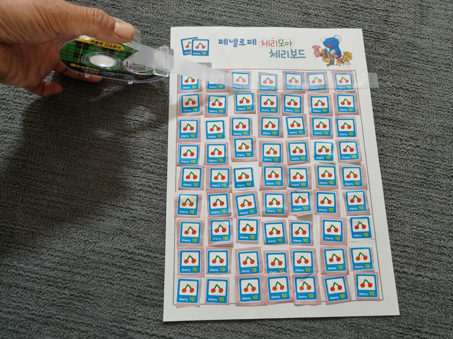 아이와 함께 열심히 체리 포인트를 모았다. 거의 4~5년 모은 거 같다. 금방 모을 줄 알았는데 생각보다 오래 걸렸다. 그냥 버린 물티슈 봉지도 있고 처음엔 모으지 않아서 그냥 버린 체리 포인트도 많다.