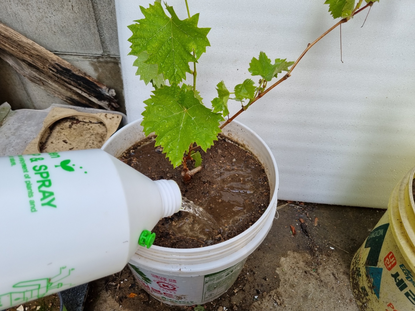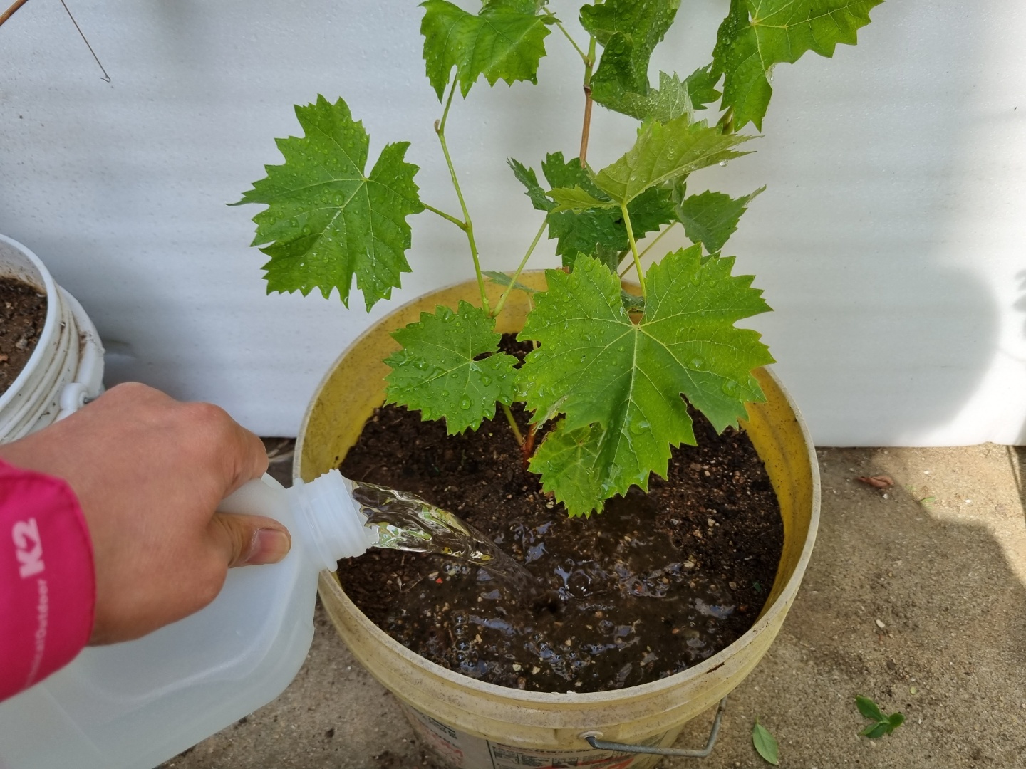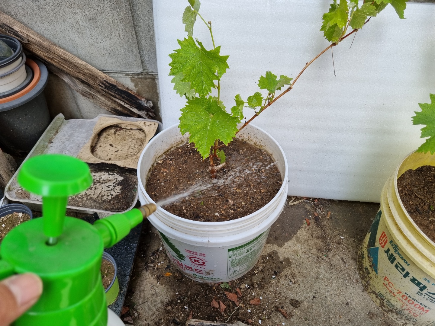 다시 심은 샤인머스캣 묘목에 물을 준다. 적당히 조금만 준다. 노란색, 하얀색 화분이다.