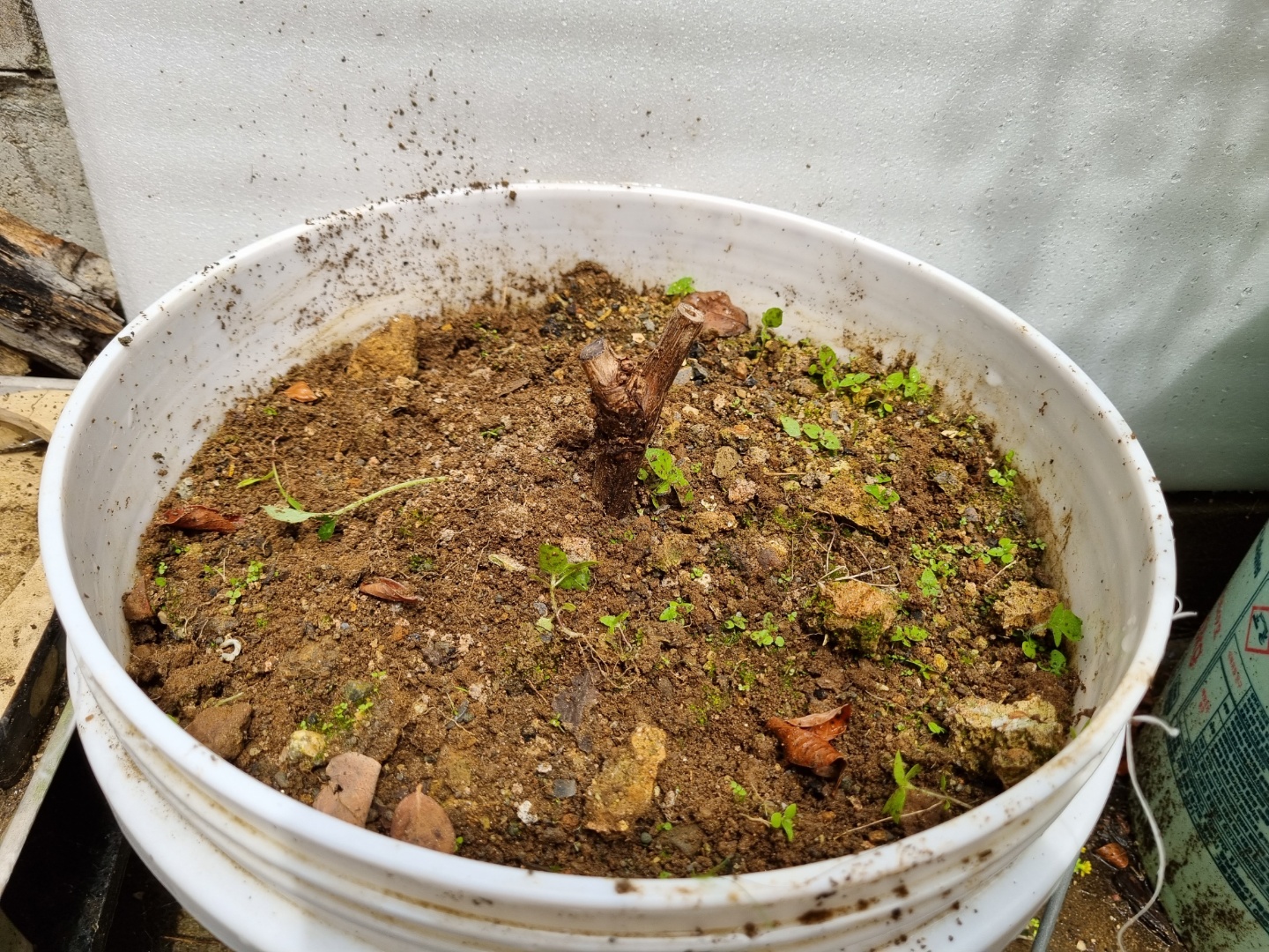 샤인머스캣 화분에서 반갑지 않은 풀들을 제거했다. 샤인머스캣 나무가 보인다. 죽었냐고요?