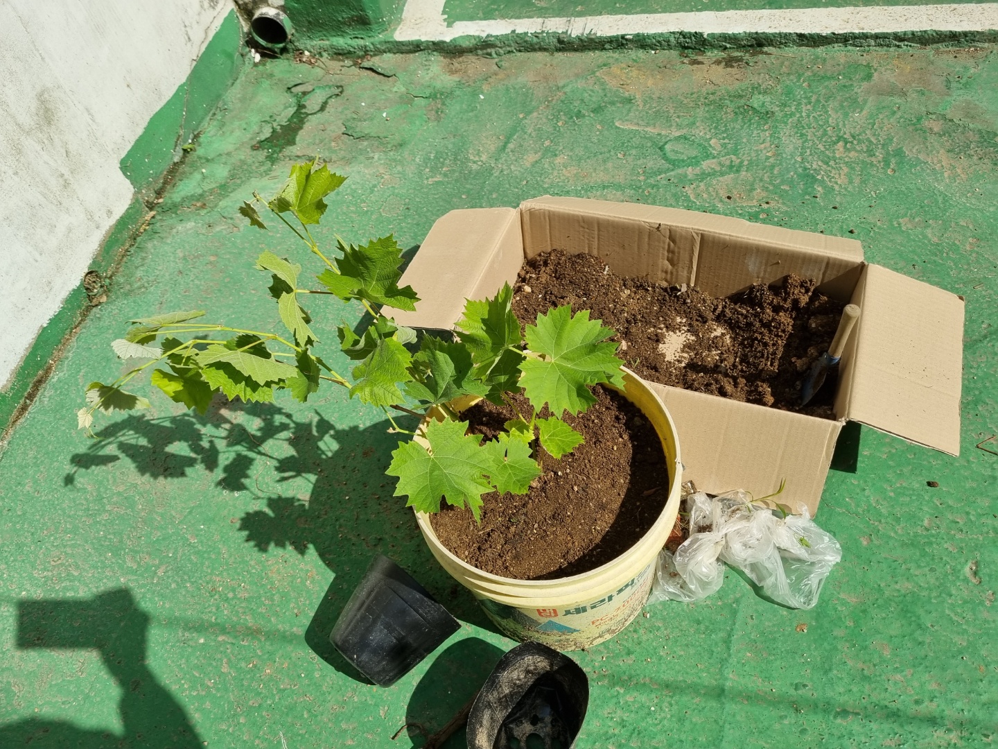샤인머스캣 묘목을 다시 심기 위해 밖으로 나가 묘목을 확인했다. 화분의 흙이 밖으로 탈출하긴 했으나 아직 잎이 싱싱했다.