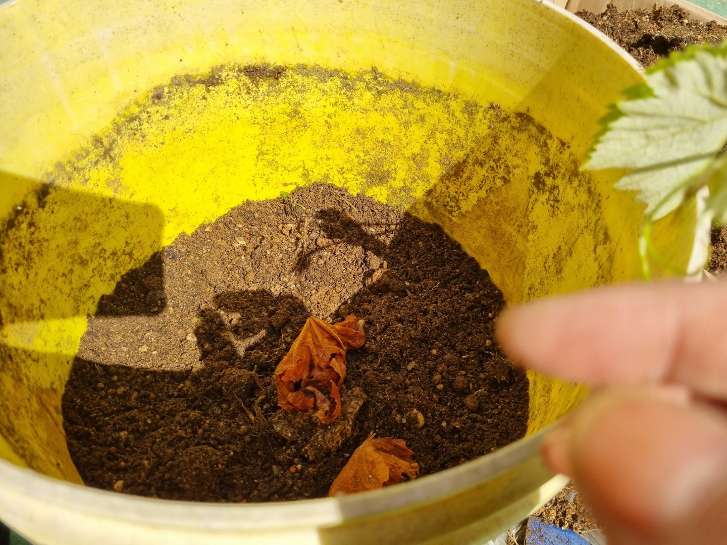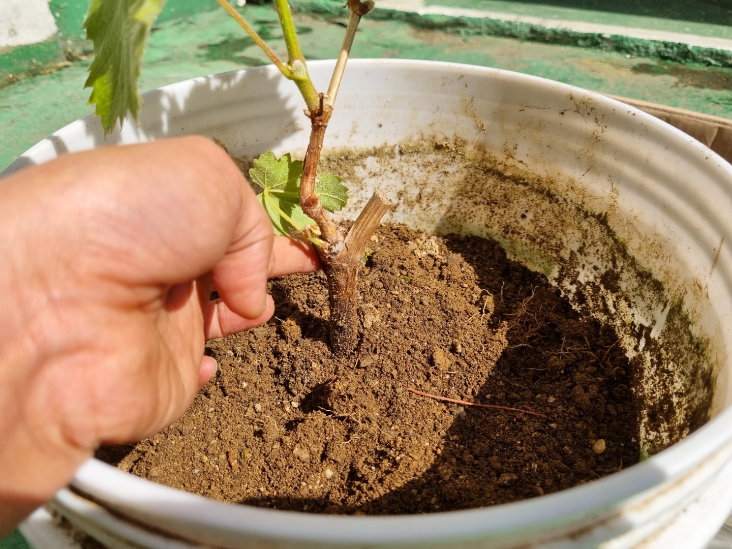 샤인머스캣 묘목을 다시 심기 위해 밖으로 나가 묘목을 확인했다. 화분의 흙이 밖으로 탈출하긴 했으나 아직 잎이 싱싱했다.