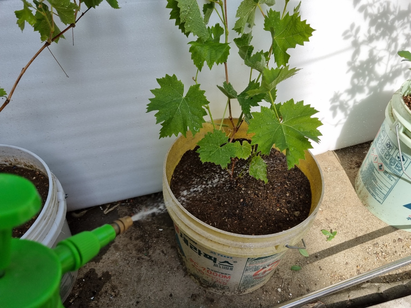 다시 심은 샤인머스캣 묘목에 물을 준다. 적당히 조금만 준다. 노란색, 하얀색 화분이다.