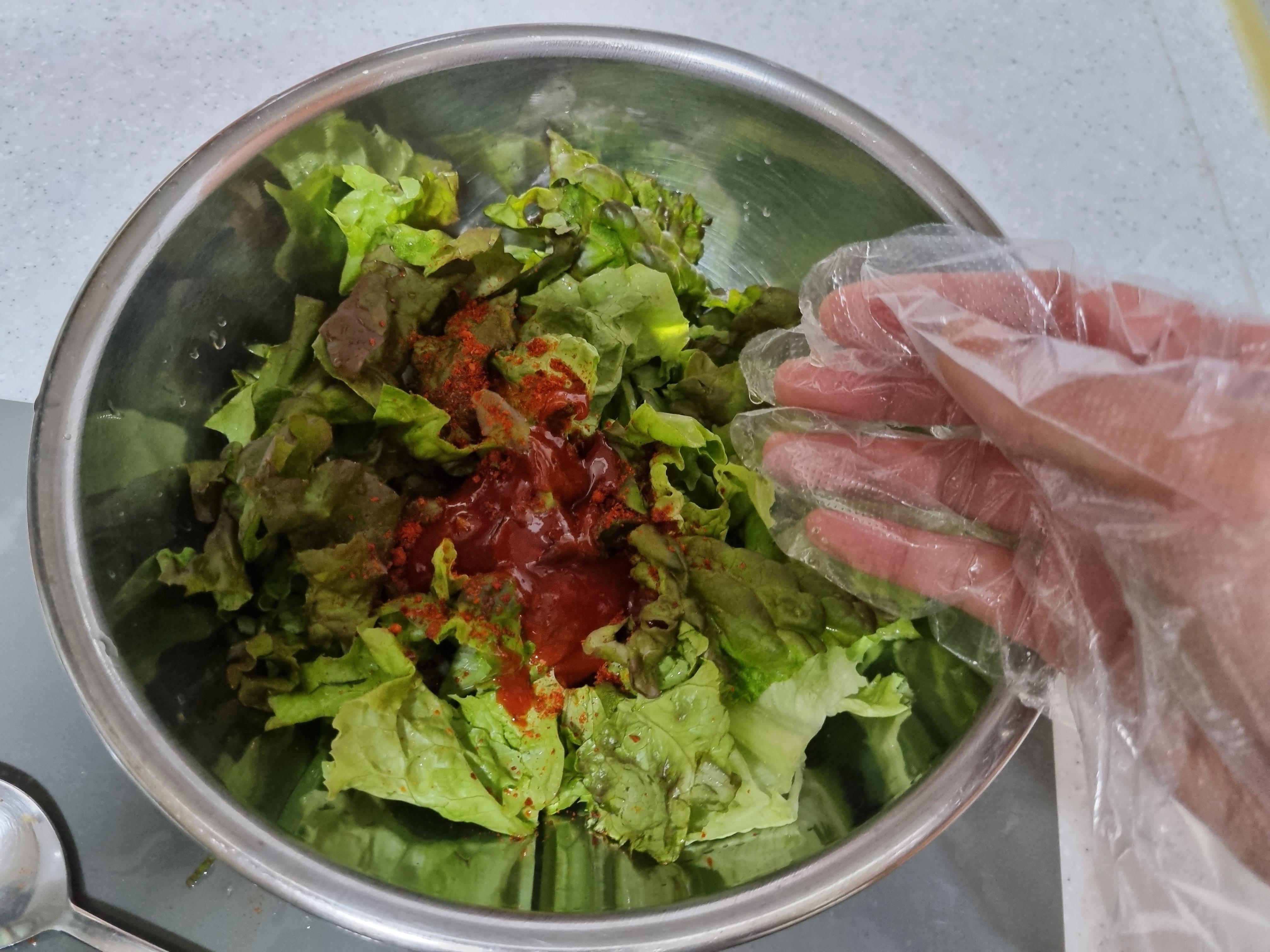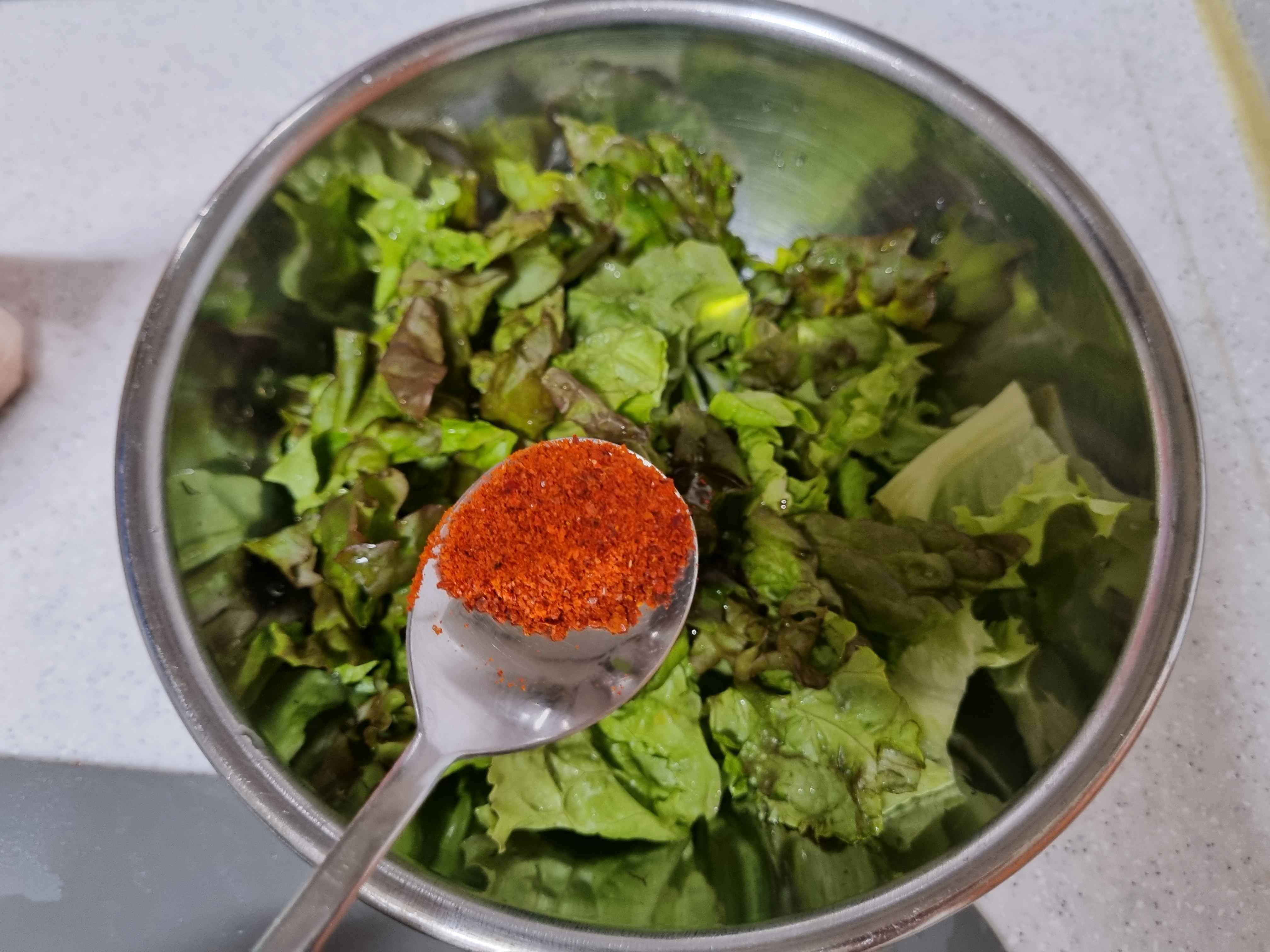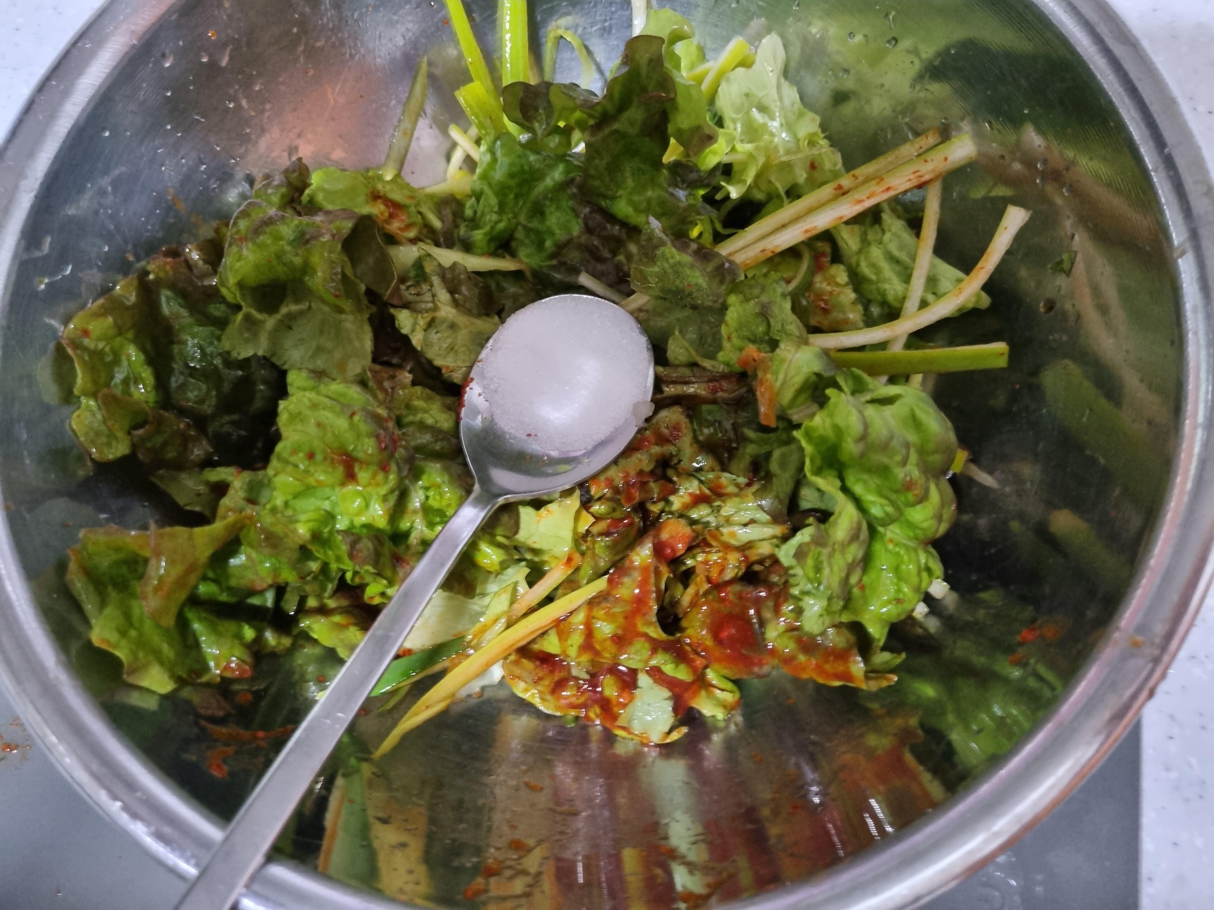 아차차! 설탕도 반 숟가락 넣어요. 그리고 버무려요. 살살 살~ 주무르면 상추가 숨이 금방 죽어요. 아주 살살 뒤적이는 정도면 충분해요.